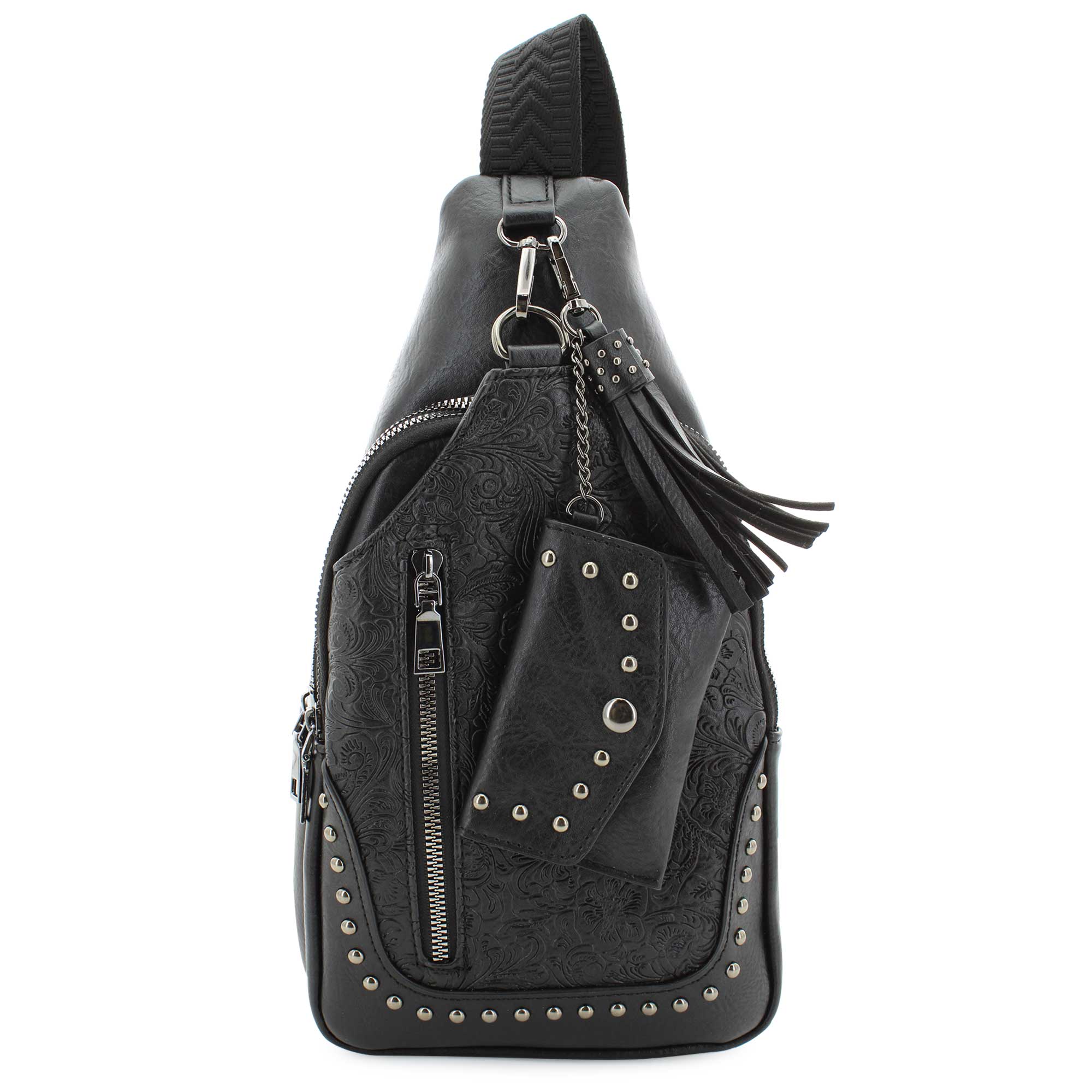 Add a stylish edge to your everyday look with the Sam & Hadley Tooled Sling with Clip-On Pouch. Featuring a beautiful floral tooled design on the front, this compact sling bag blends feminine charm with edgy details like eye-catching studded accents. Multiple zippered pockets offer secure storage for your essentials, while the adjustable sling strap ensures a comfortable, customizable fit. Perfect for on-the-go fashionistas, this versatile bag is ideal for shopping trips, festivals, travel, and everyday wear. Shop SHOE SHOW MEGA today.