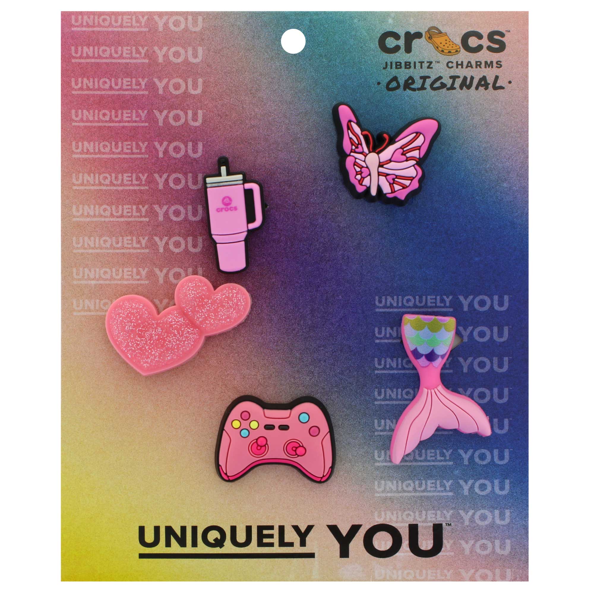 - Girly-themed pack includes the following Jibbitz: a pink butterly, a pink mermaid tail, a pink game controller, double pink hearts, and a pink insulated cup