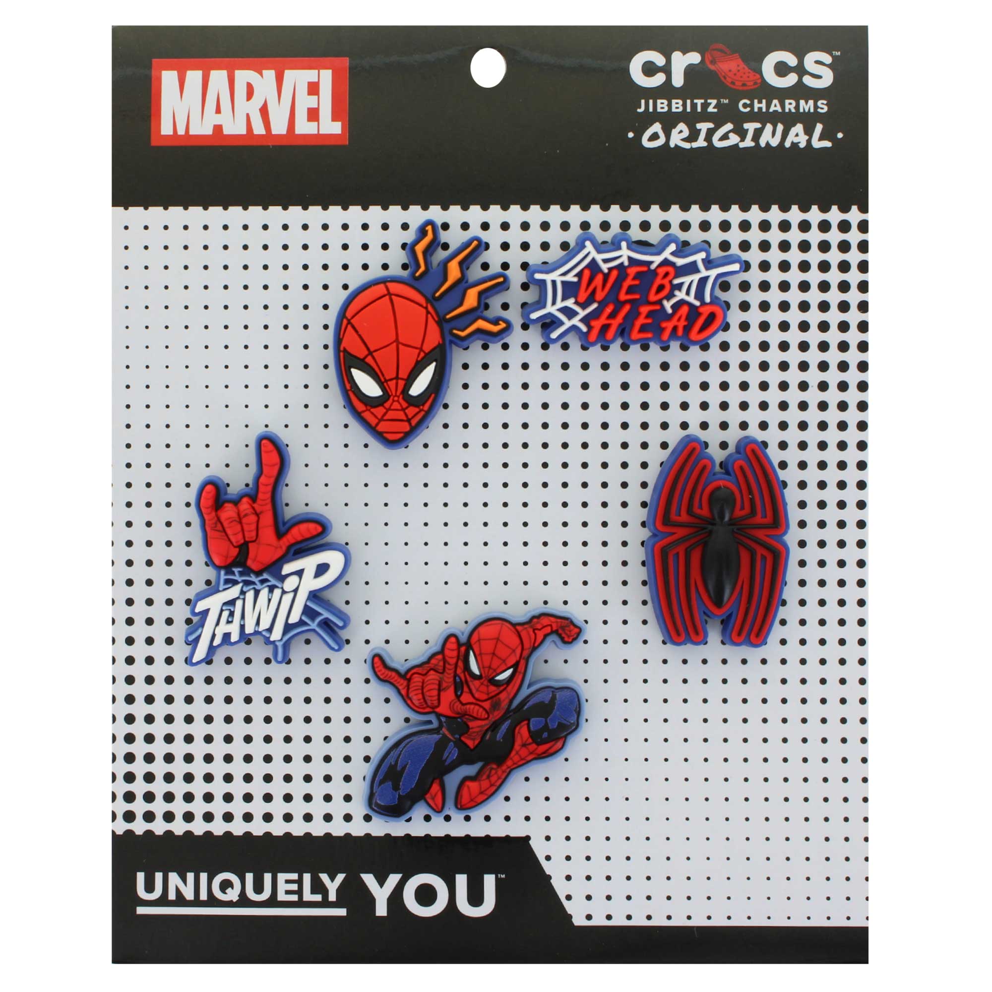 - Spider-Man themed pack includes the following Jibbitz: Spider-Man head, web head graphic, Spider-Man logo, action Spider-Man, and web-throwing Spider-Man hand