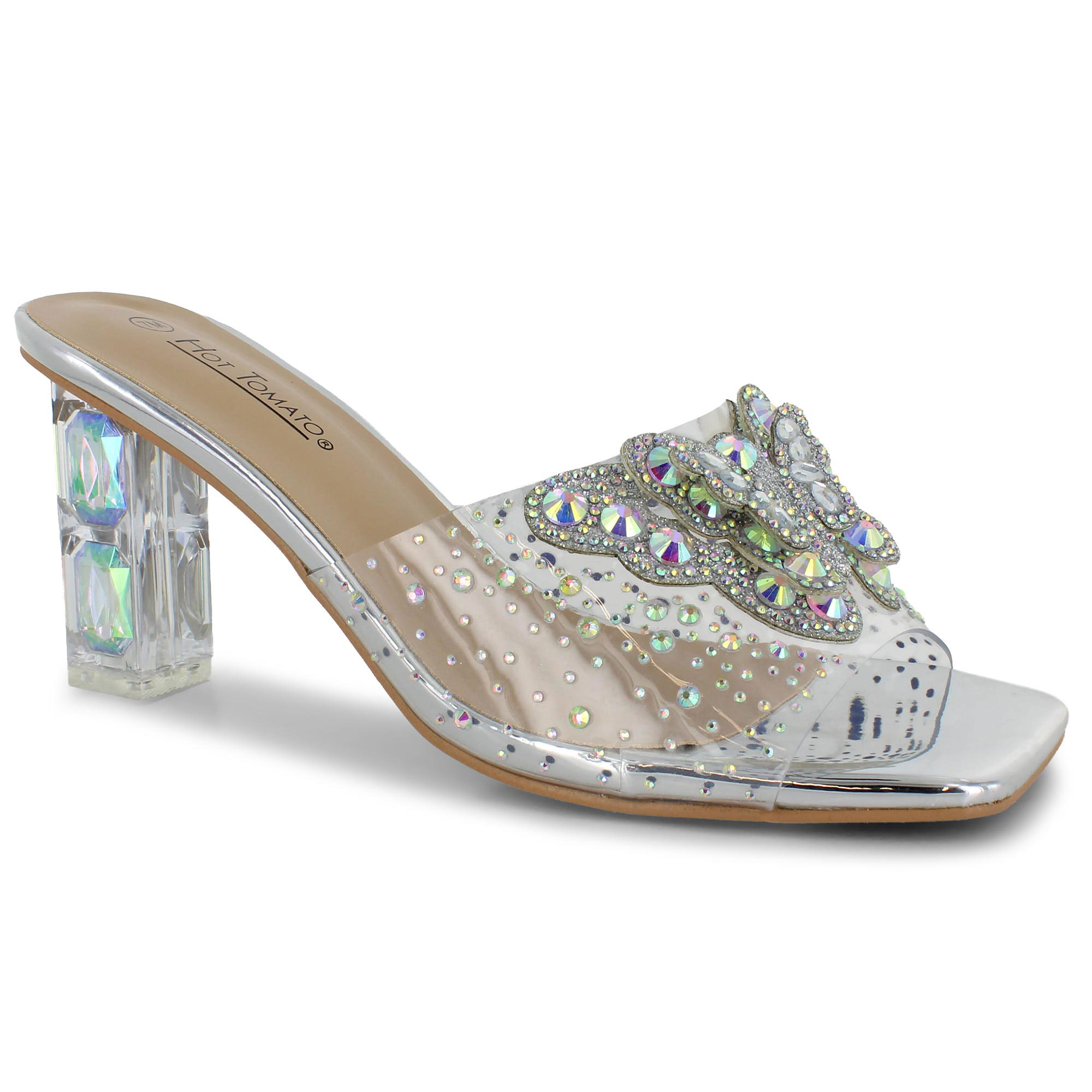 Make a lasting impression in the Hot Tomato Zadie heel. This slip-on heel features a square-toe, block heel and lightly padded insole. The clear upper and heel are adorned in rhinestones and finished with a 3D rhinestoned butterfly detail to complete this show-stopping look.