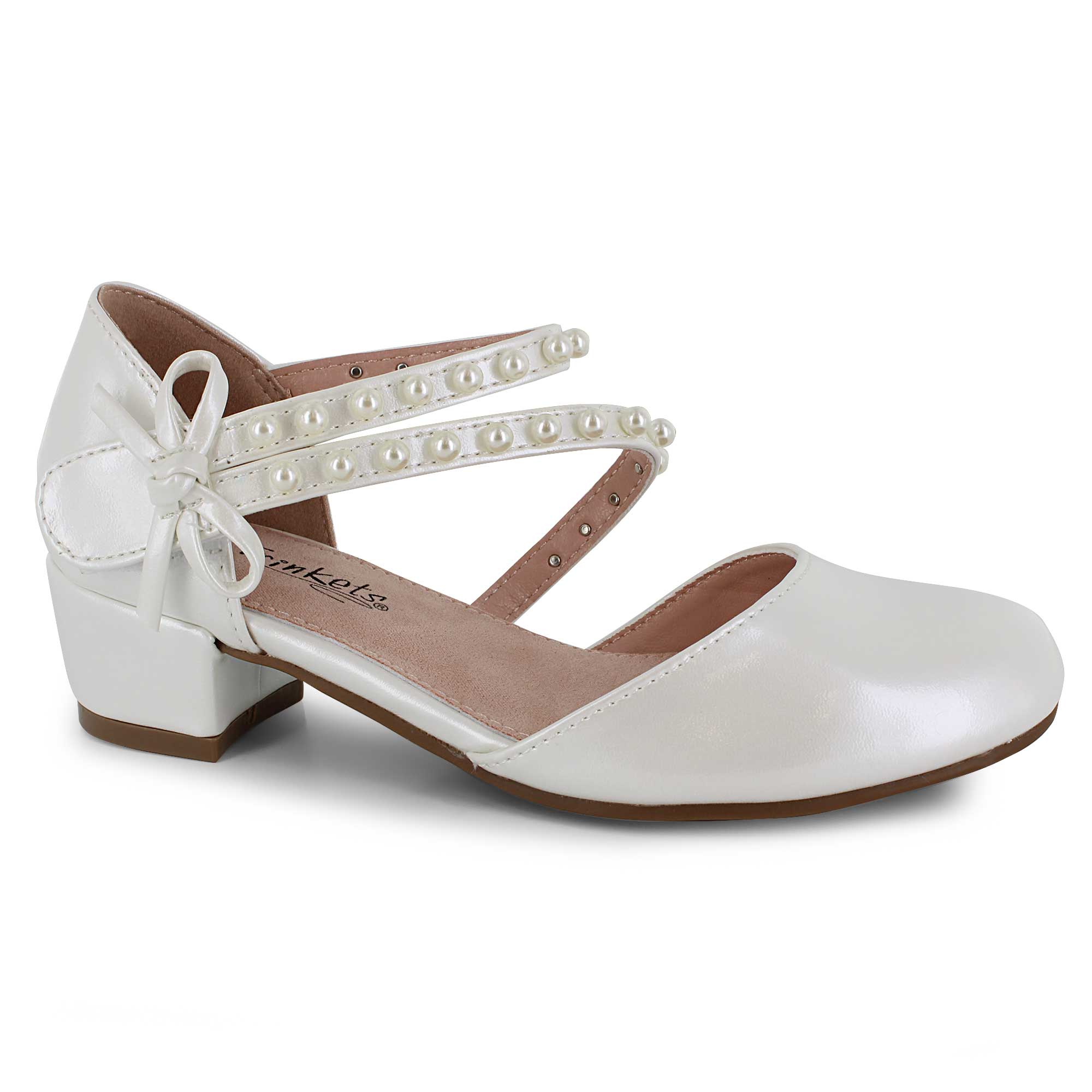 These Trinkets dress shoes bring timeless elegance with a secure strap closure and sweet faux-pearl accents. A rounded toe and raised heel add a classic touch that's perfect for dressing up. Ideal for weddings and special occasions, they offer both style and comfort for the big day.