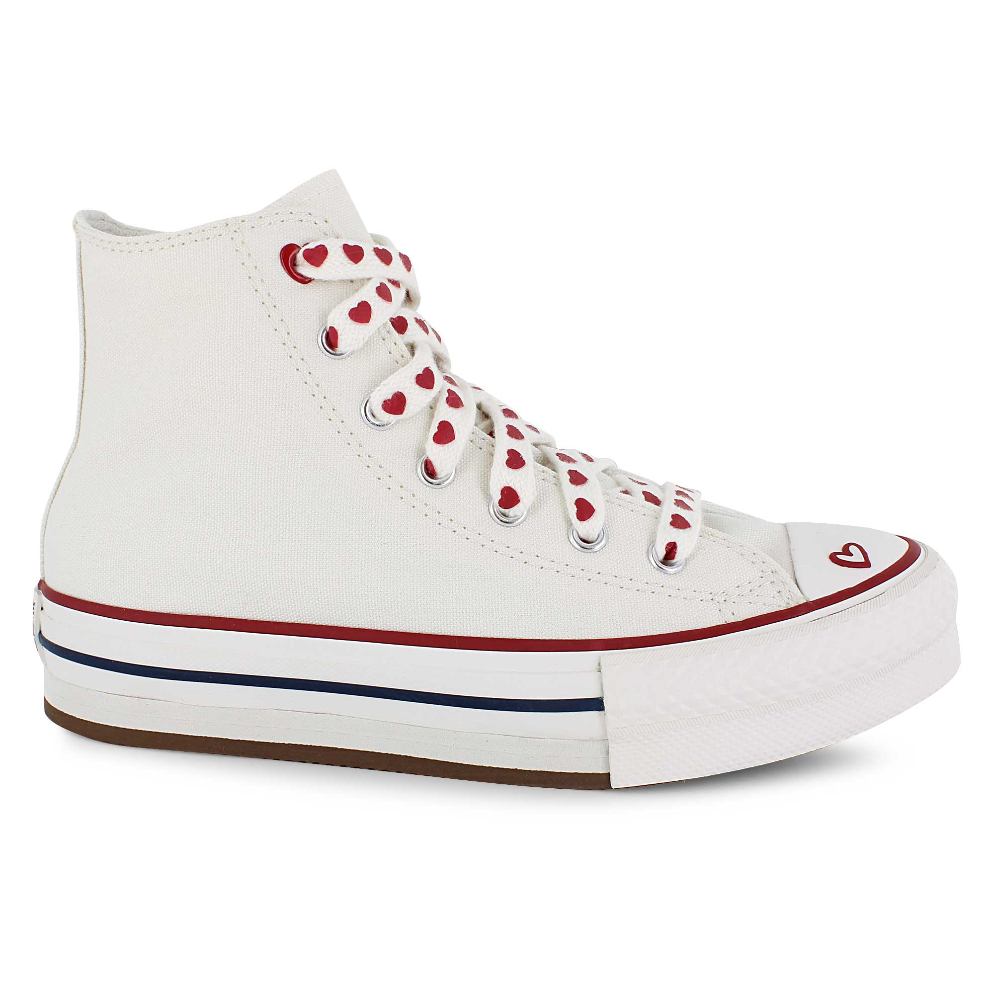 Show off iconic Converse style with a fresh, elevated twist. These hi-top sneakers feature a classic canvas upper, signature Chuck Taylor ankle patch, and a durable platform midsole for added height. Finished with cute heart-patterned laces, they're perfect for school days and casual weekends with friends.