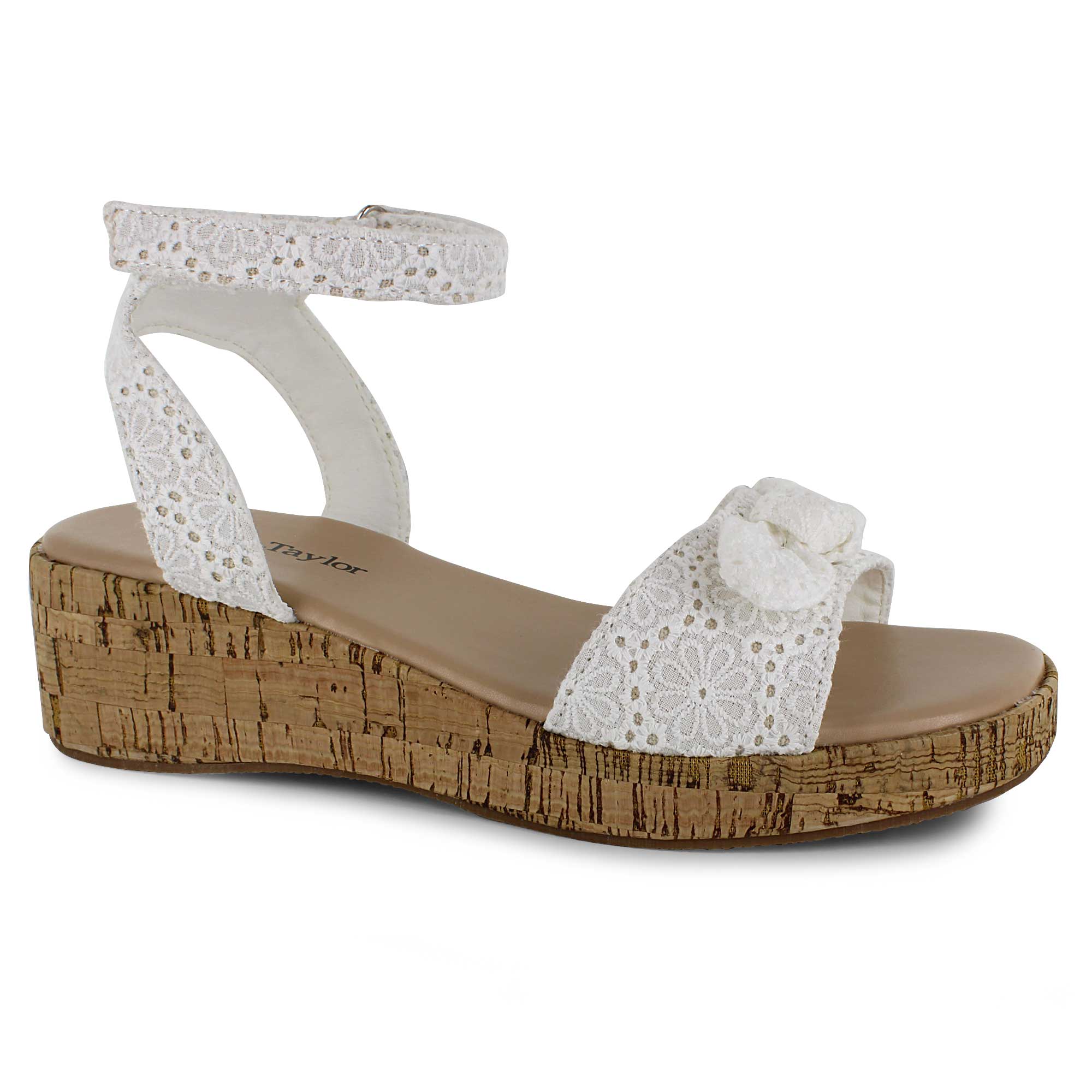This Sophia Taylor platform shoe features a cute floral patterned fabric upper with a charming bow accent on the toe strap. A wrap-around ankle strap closure ensures a secure, adjustable fit. The lightweight faux-cork sole adds natural style and comfortable lift for warm-weather wear.