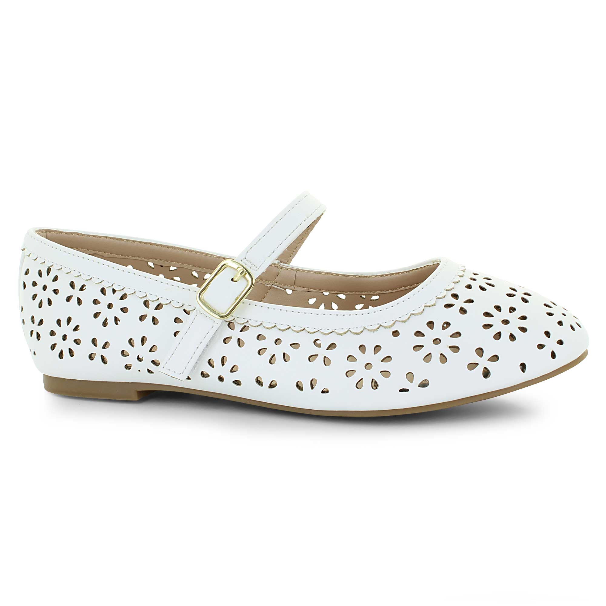 Make spring bloom with eye-catching Sugar dress flats. Flower burst cutouts add a playful touch to the perforated upper, while a strap closure keeps the fit secure. A flat, flexible sole makes them easy to wear for parties or everyday outings.