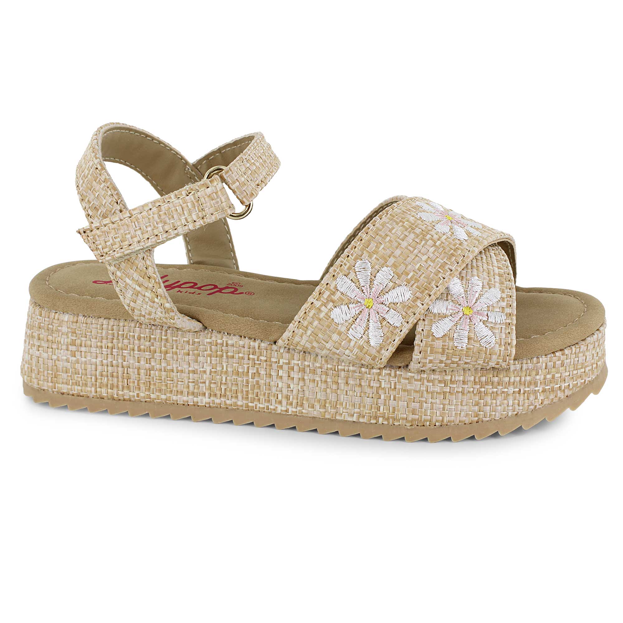 Jellypop sandals bring fresh summer style to any look. Embroidered daisy flowers accent the simple straps, while a platform sole offers a subtle, stylish lift. A strap closure provides an easy and secure fit throughout the day.
