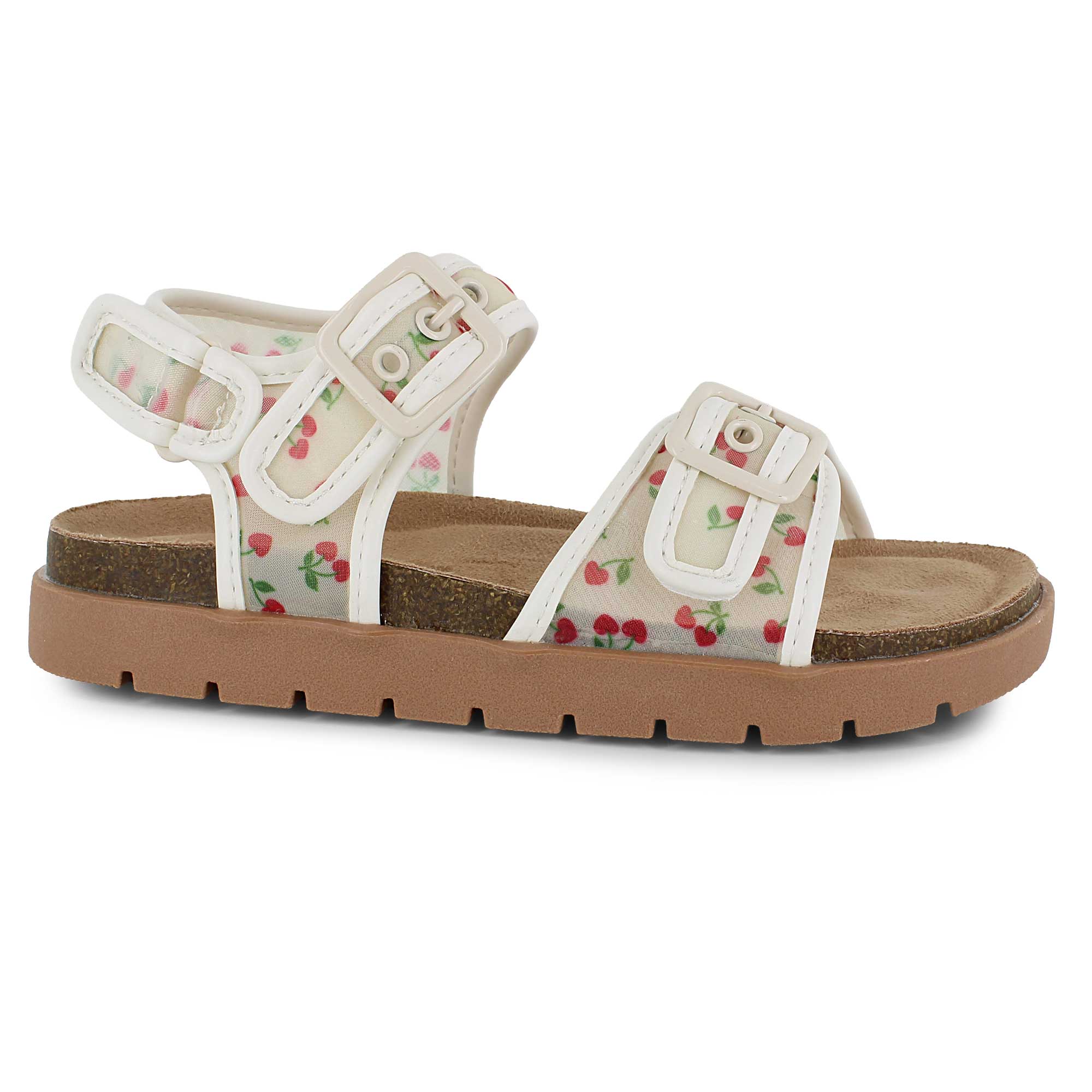 You'll love these trend-setting sandals, featuring a whimsical see-through mesh upper scattered with cute cherry patterns. A trio of straps topped with faux buckles adds a touch of sophistication while keeping the fit perfectly snug and secure. With a lightly cushioned footbed, these fruity favorites are ready to turn every sidewalk into a stylish runway.