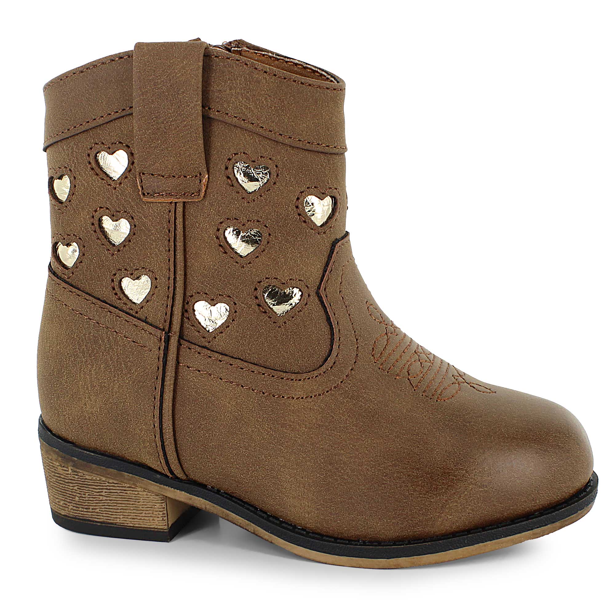These adorable toddler boots blend classic Western style with playful charm, featuring a low heel and a convenient side zipper for easy on and off. Cutout heart shapes adorned with shimmering gold foil accents add a sweet, eye-catching touch. Perfect for little adventurers, these boots bring both comfort and cowboy flair to every step.