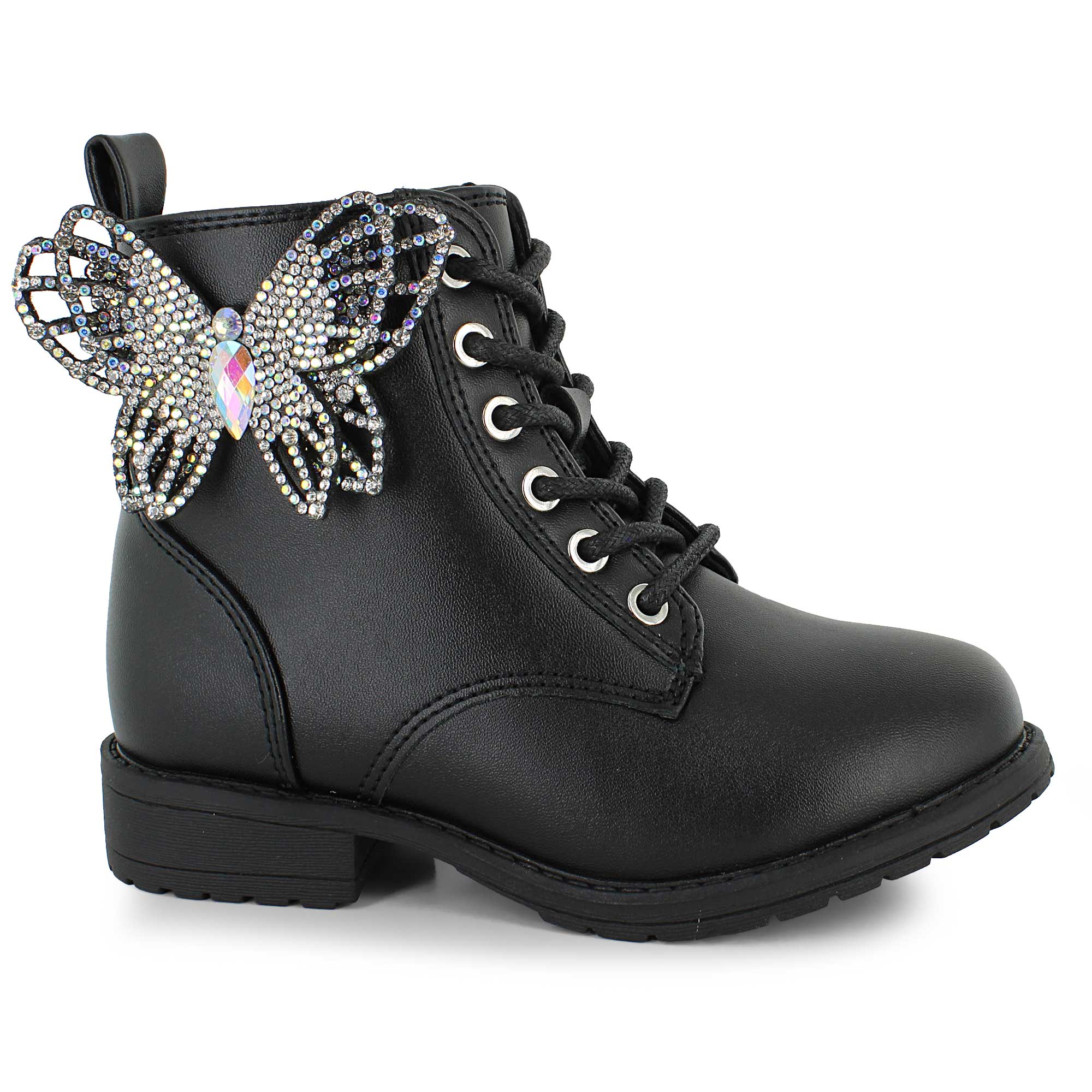 Add a little sparkle to every step with these fashion-forward lace-up boots for kids. A side zipper makes them easy to slip on and off, while a large rhinestone butterfly adds a bold, glitzy touch. Lightweight and comfortable, they're perfect for dressing up any outfit with extra shine.