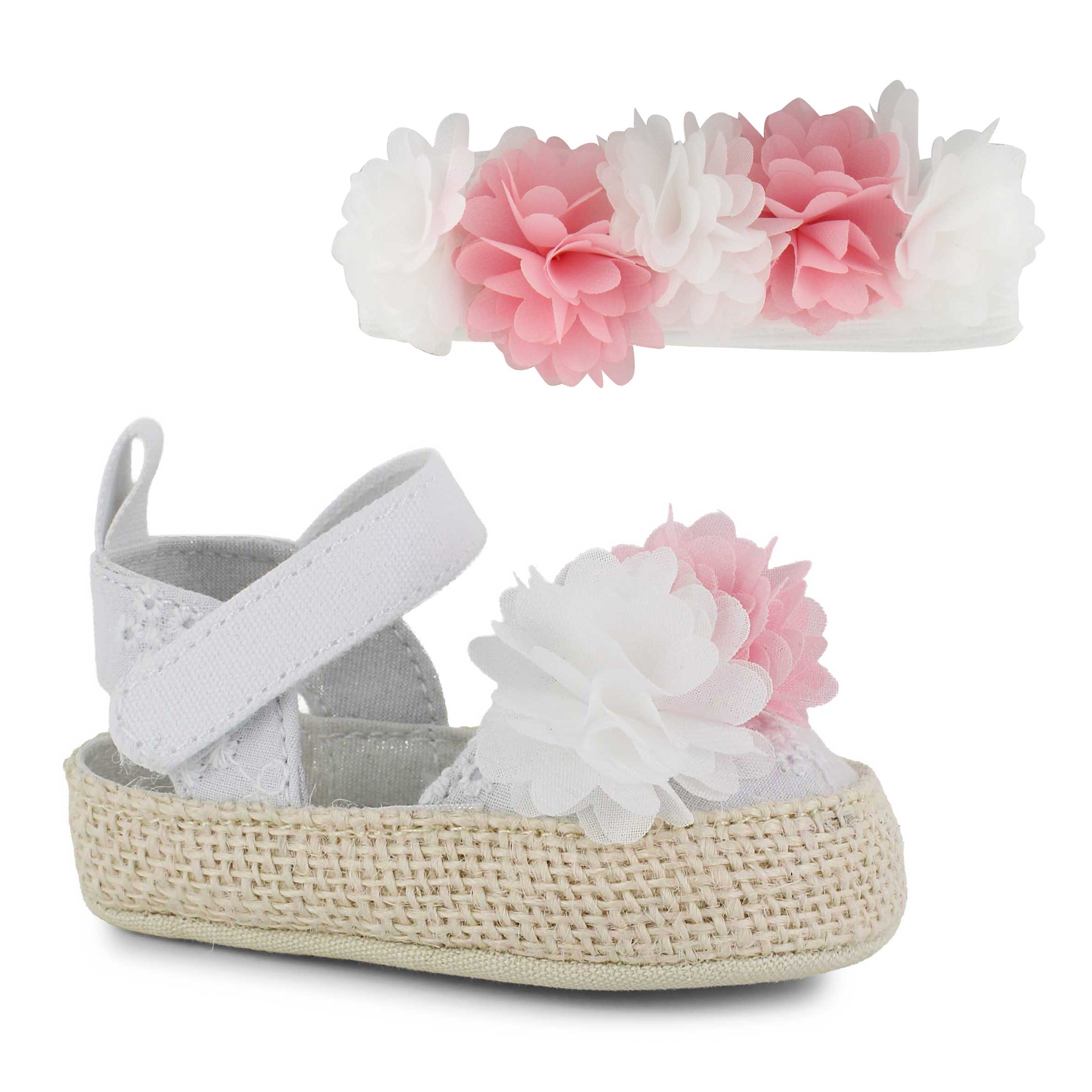 Fresh for spring, this Stepping Stones shoe features a cute embroidered upper with a trio of bold tulle flower accents for standout charm. The easy strap closure keeps little feet secure and comfortable. A matching headband completes the look for an effortlessly cute outfit.