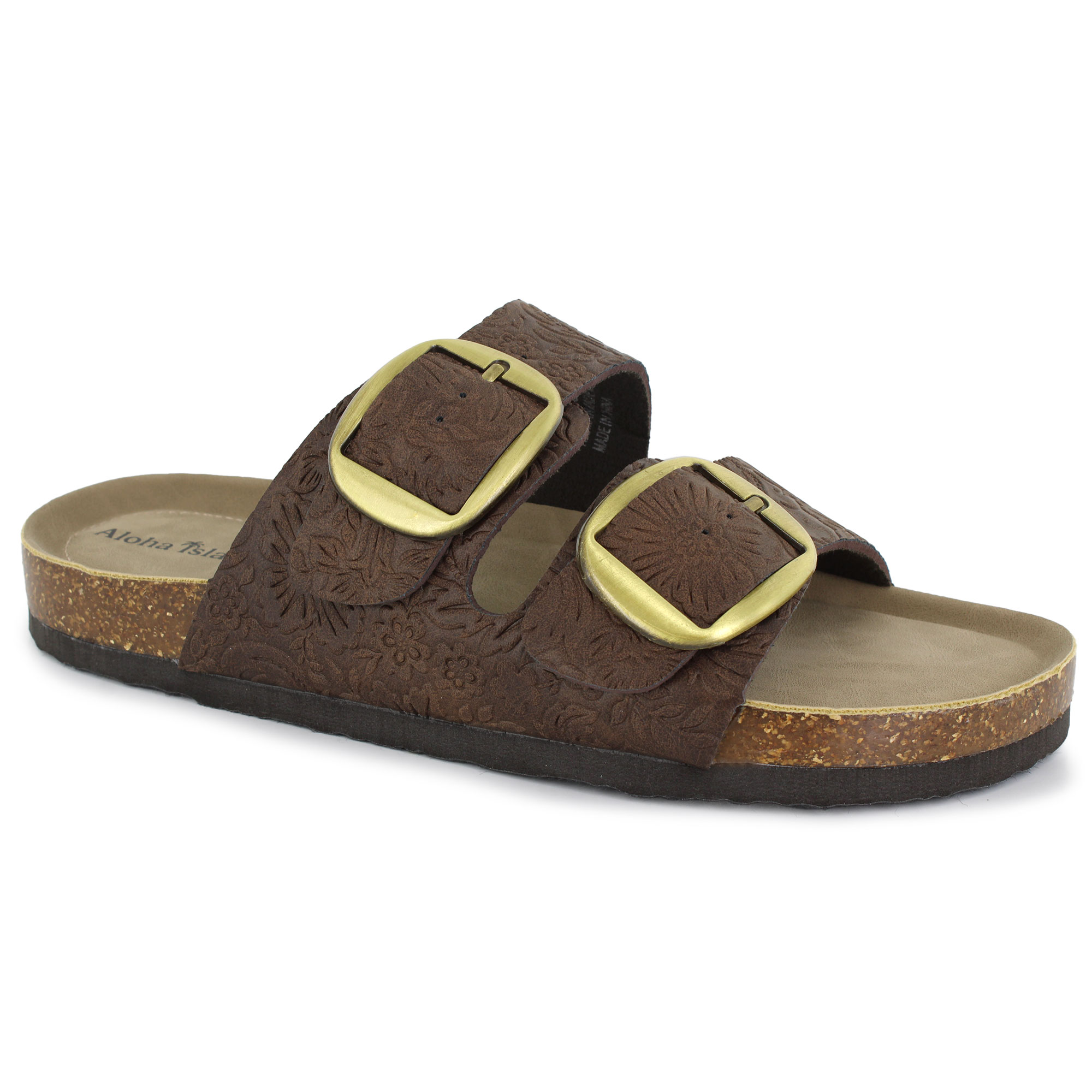 Embrace effortless comfort and style with the Aloha Island Sedona slide sandal. Designed with a faux-leather upper and dual buckle closures, this sandal provides a secure and adjustable fit. The cushioned contoured insole provides arch support for all-day wear, while the cork midsole delivers lightweight cushioning. A durable traction outsole ensures stability, making this sandal a perfect choice for casual outings or vacation adventures.
