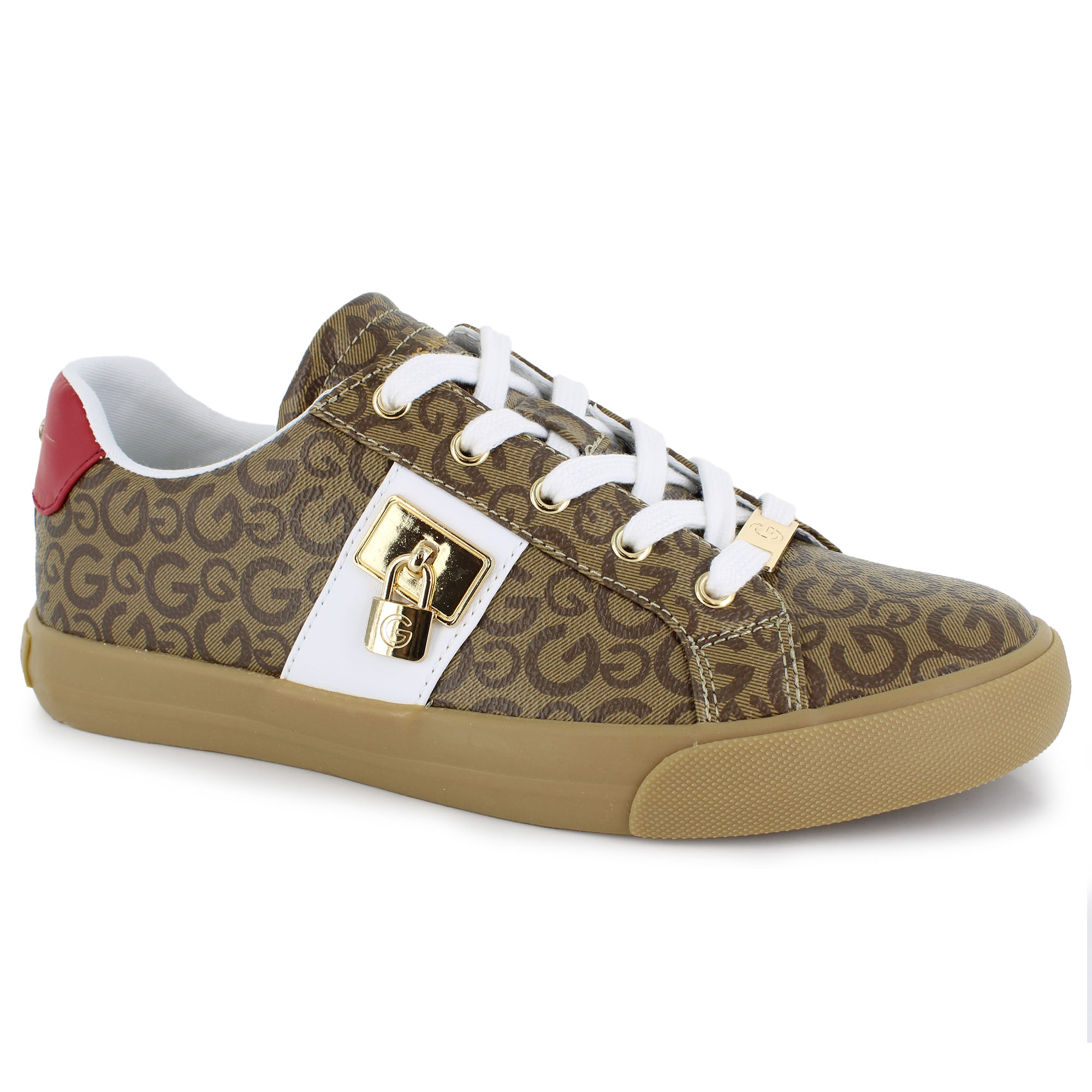 Step into high-end style with the Guess GBG Opala. Dressed in a premium faux-leather G-pattern and accented with signature gold-tone charms, these sneakers turn the sidewalk into a runway. A striking red heel cap with a G-stud adds a bold pop of color, while the cushioned insole and durable rubber outsole ensure your commute feels as good as it looks.
