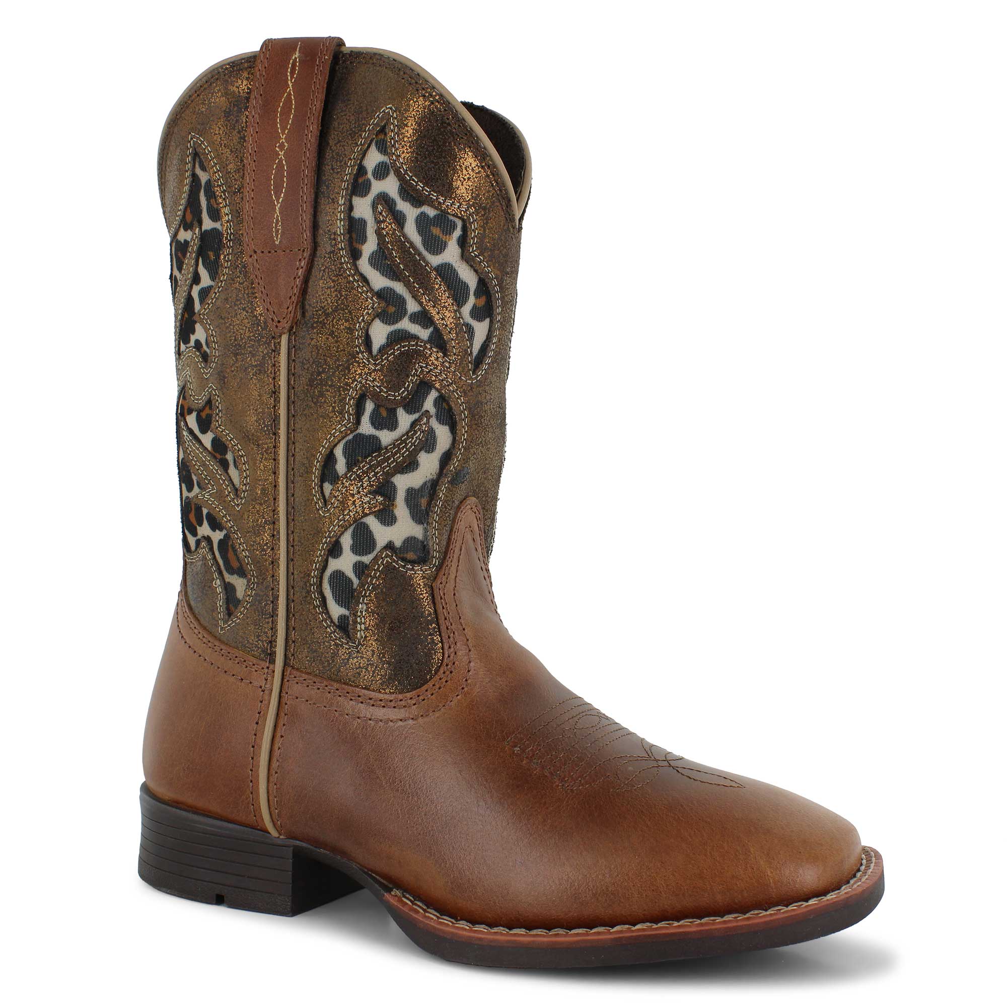 Western wear gets a fierce upgrade in the Flex West Tuscon boot. Featuring western stitching, leopard print detailing and a shimmery upper for a bold look. Finished with a square toe, block heel and pull tabs for a classic feel.