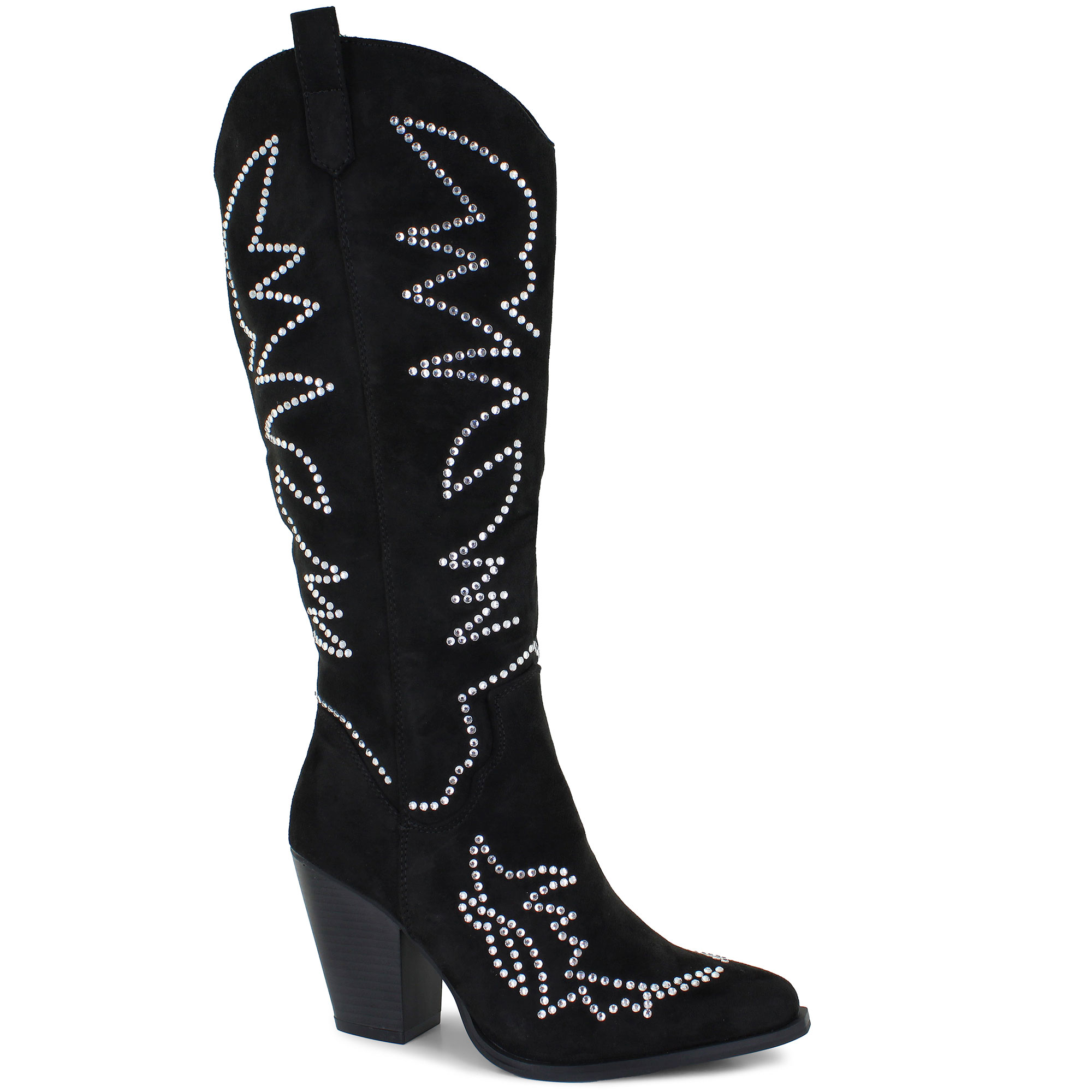Western charm meets sparkle in the Hot Tomato Bellamie knee high boot. Country inspired rhinestoned details make a bold statement while the block heel keeps your steps secure. A side pull tab and side zipper allows for quick and easy changes. Perfect for concerts, line dancing and everything in between.