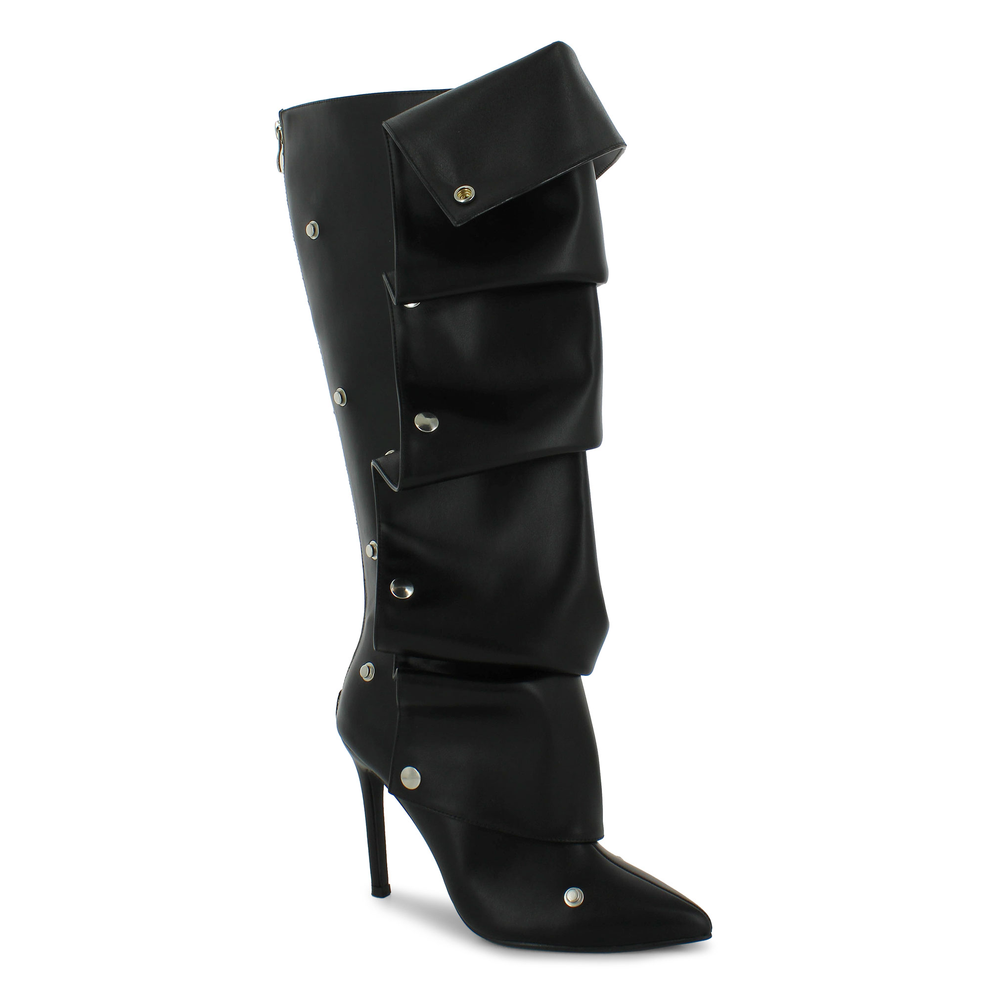 Make your mark in the fashion-forward Yoki Nayla-39 boot. The stiletto heel and pointed toe deliver a striking silhouette, while the folded fabric and metallic snap accents add customizable, edgy, and on-trend detail. A convenient back zipper ensures you're out the door in no time. Perfect for nights out or bold daytime looks, these boots bring serious attitude to your style.