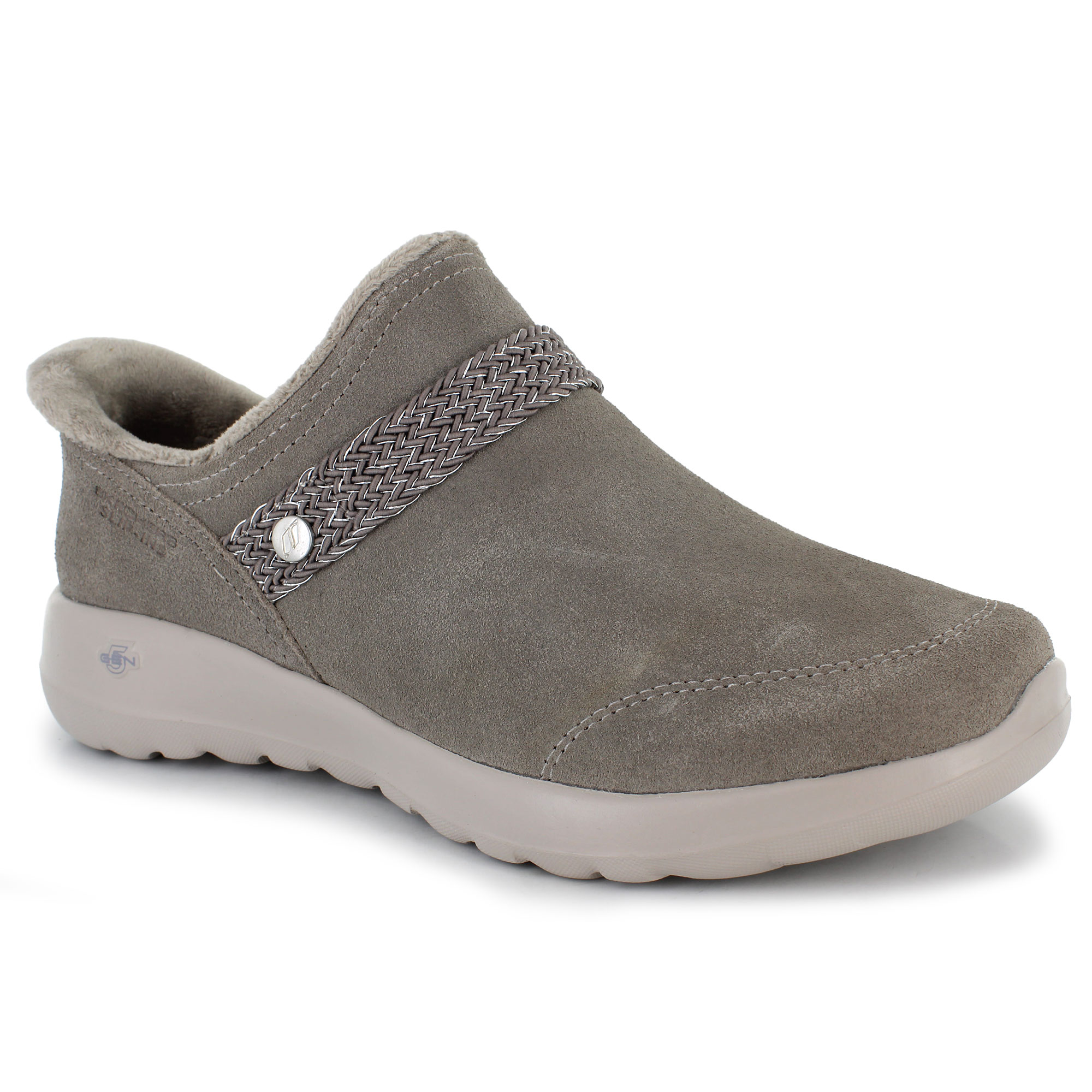 The Skechers Hands Free Slip-ins: On-the-GO Joy - Brandie delivers style and warmth with exceptional convenience. Designed for indoor or outdoor use, it boasts a plush chenille lining and Air-Cooled Memory Foam for ultimate comfort. The suede upper is 3M Scotchgard-treated to repel moisture, while 5GEN cushioning and the hands-free entry system make it your effortless go-to shoe.