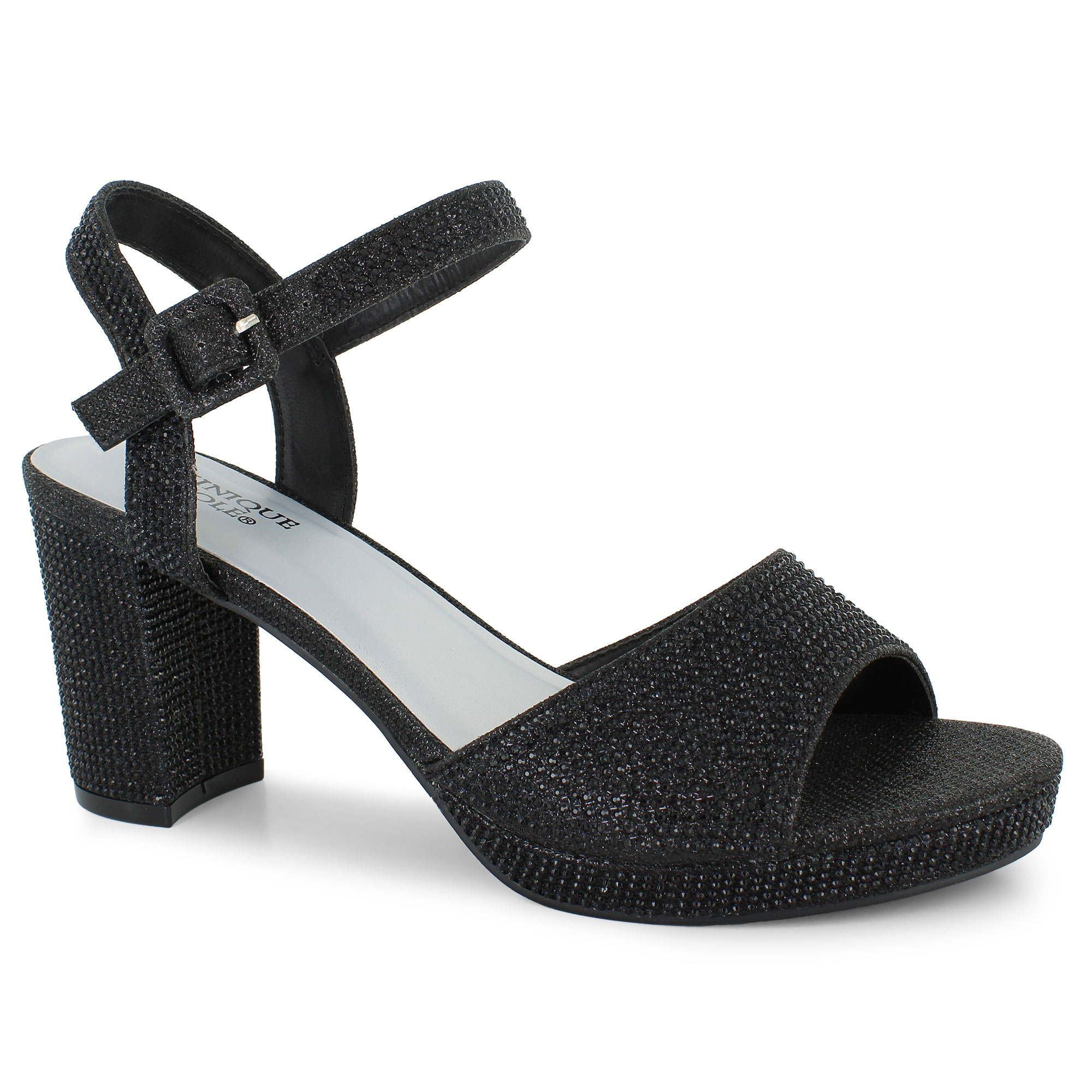 Shine bright with every step in the Dominique Nicole Pamela heel. A sturdy block heel and adjustable ankle strap offer the perfect blend of support and style. Covered in dazzling rhinestones, these heels were made to stand out. The perfect finishing touch to elevate your evening ensemble.