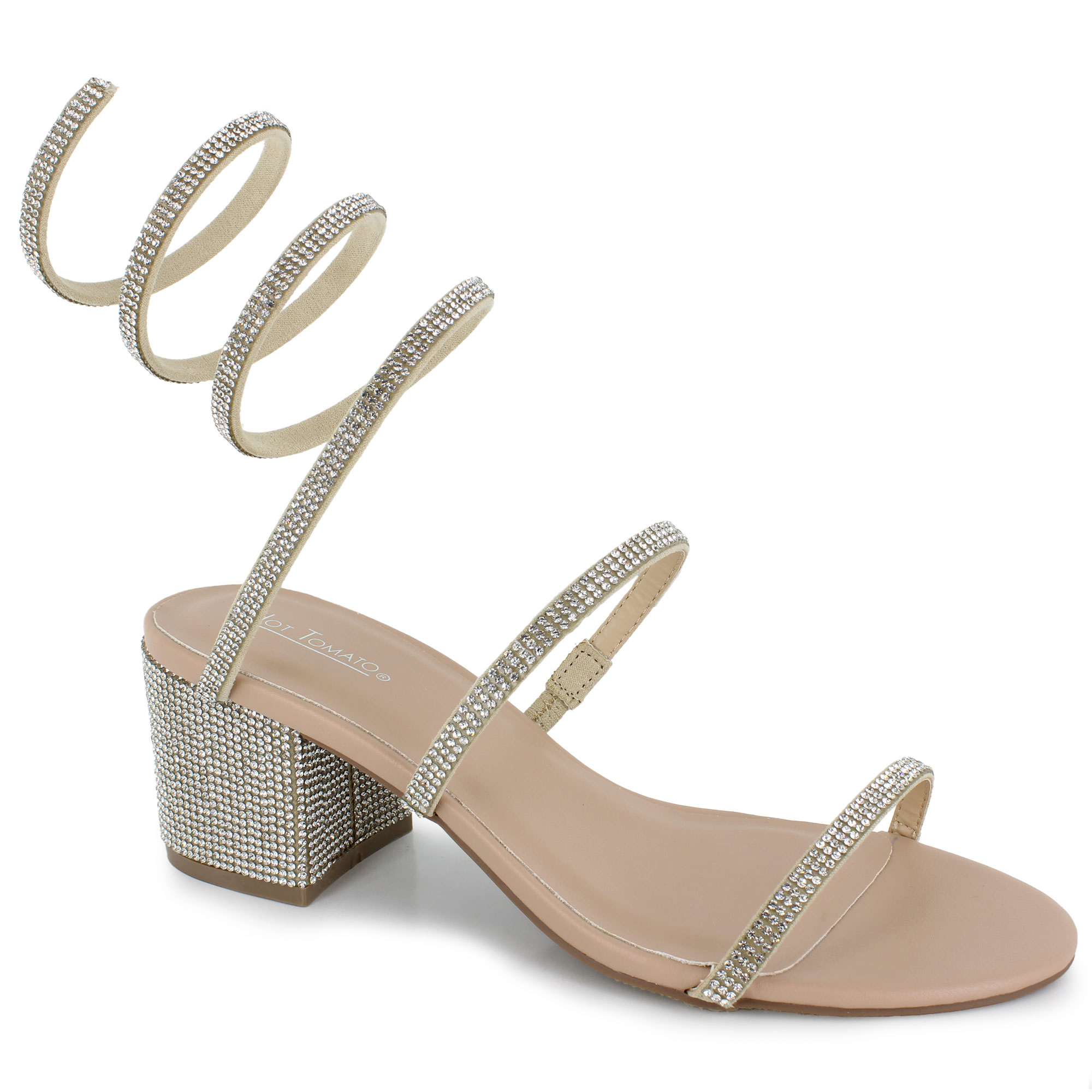 Elevate your evening attire with the refined brilliance of the Nellie Wrap by Hot Tomato. This sophisticated sandal strikes the perfect balance between comfort and dazzle, featuring a mid-height block heel wrapped in premium rhinestones. The elegant spiral ankle detail adds a modern, sculptural touch to your look, elongating the leg and providing a custom-feel fit.