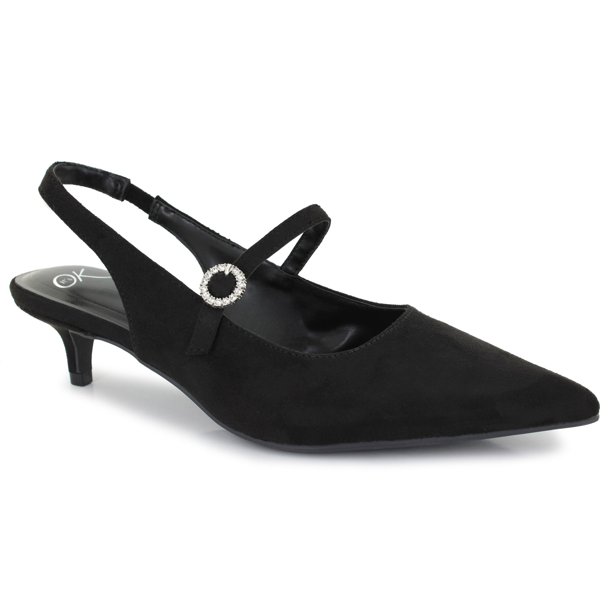 Complete your outfit with refined elegance with the It's OK Cindy heel. Designed for comfort, they feature a chic pointed toe and an adjustable fit with a stretchy back strap and adjustable top strap. The eye-catching rhinestone buckle adds a hint of sparkle making these heels perfect for adding a touch of sophistication to any outfit.