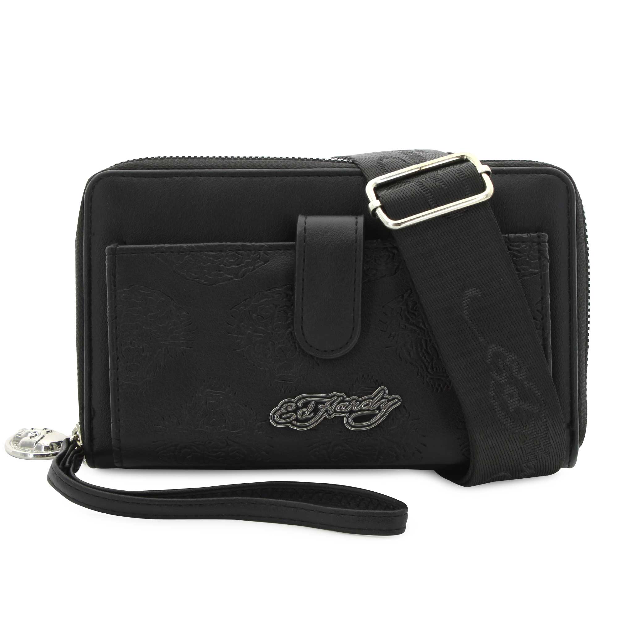 The Ed Hardy Lizzy Wallet-On-A-String is the ultimate multitasking accessory that comes with the functionality of a wallet, the convenience of a wristlet, and the hands-free ease of a crossbody bag. Crafted with Ed Hardy's iconic tattoo-inspired artwork, this wallet brings bold style and everyday practicality into perfect balance. Designed for maximum storage and organization, it features multiple card slots, a zippered coin pocket, a phone compartment, and space for cash or receipts, all in a compact, easy-to-carry silhouette. Wear it three ways: crossbody for hands-free errands, wristlet for grab-and-go outings, or remove the straps and slip it into your favorite bag. Shop SHOE DEPT. ENCORE today.