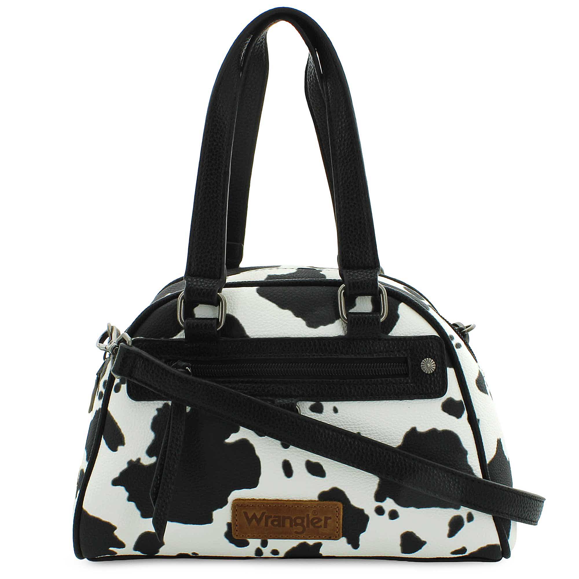 The Wrangler Cow-Print Satchel blends bold Western flair with everyday functionality, making it the perfect statement piece for trendsetters who love rustic style. Featuring a striking cow-print design inspired by classic ranch aesthetics, this satchel adds a touch of country charm to any outfit, whether you'reheading to brunch, a concert, or a casual day out. Crafted with durable materials, the Wrangler satchel is designed for both style and practicality. Its spacious interior easily holds your daily essentials like your wallet, phone, makeup, and more, while multiple compartments help keep everything organized. Sturdy top handles and an adjustable shoulder strap provide versatile carrying options, ensuring comfort wherever you go.