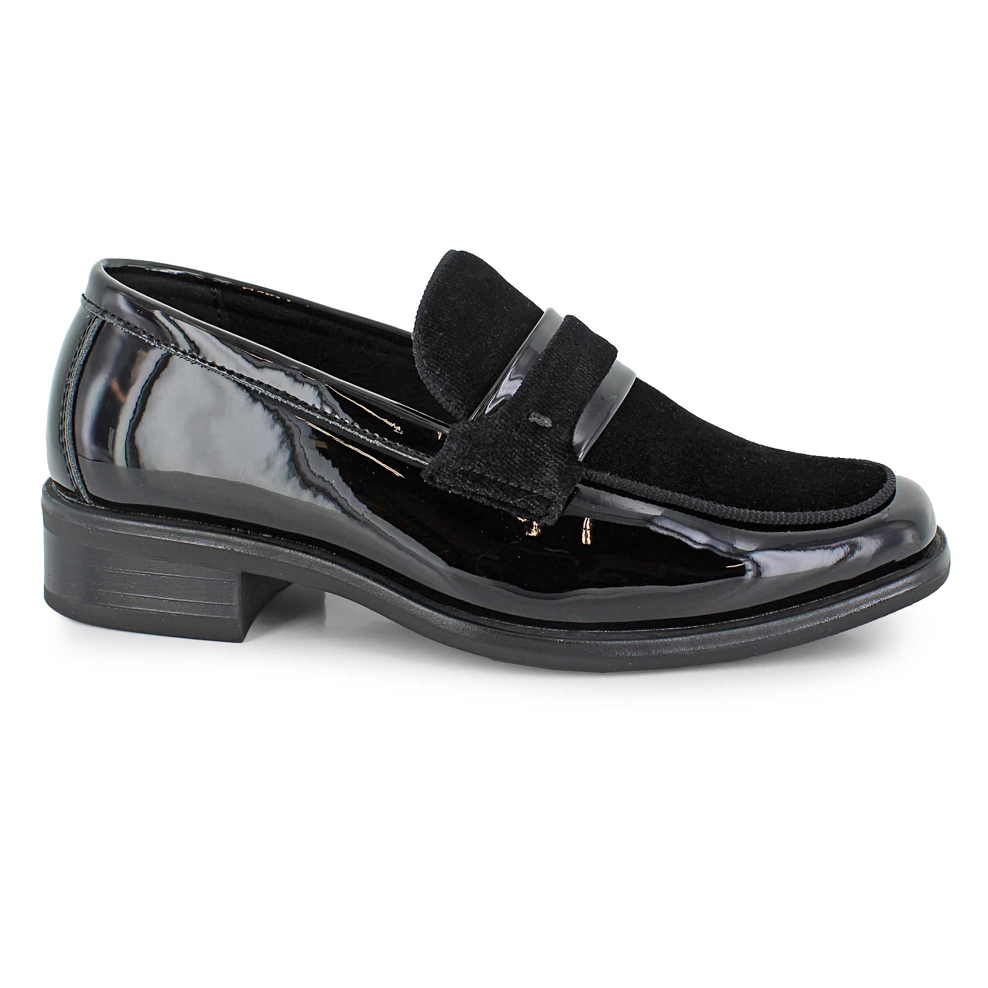 - glossy synthetic patent upper with velveteen detailing