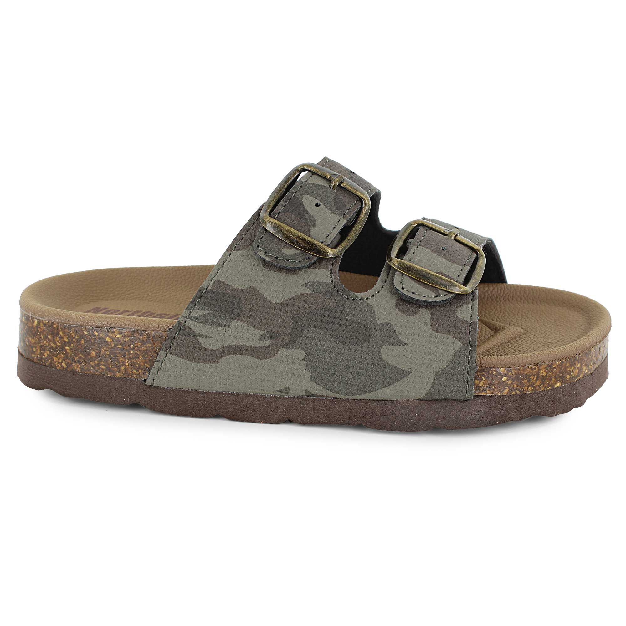 - slip-on footbed sandal with two adjustable buckle straps along top of foot