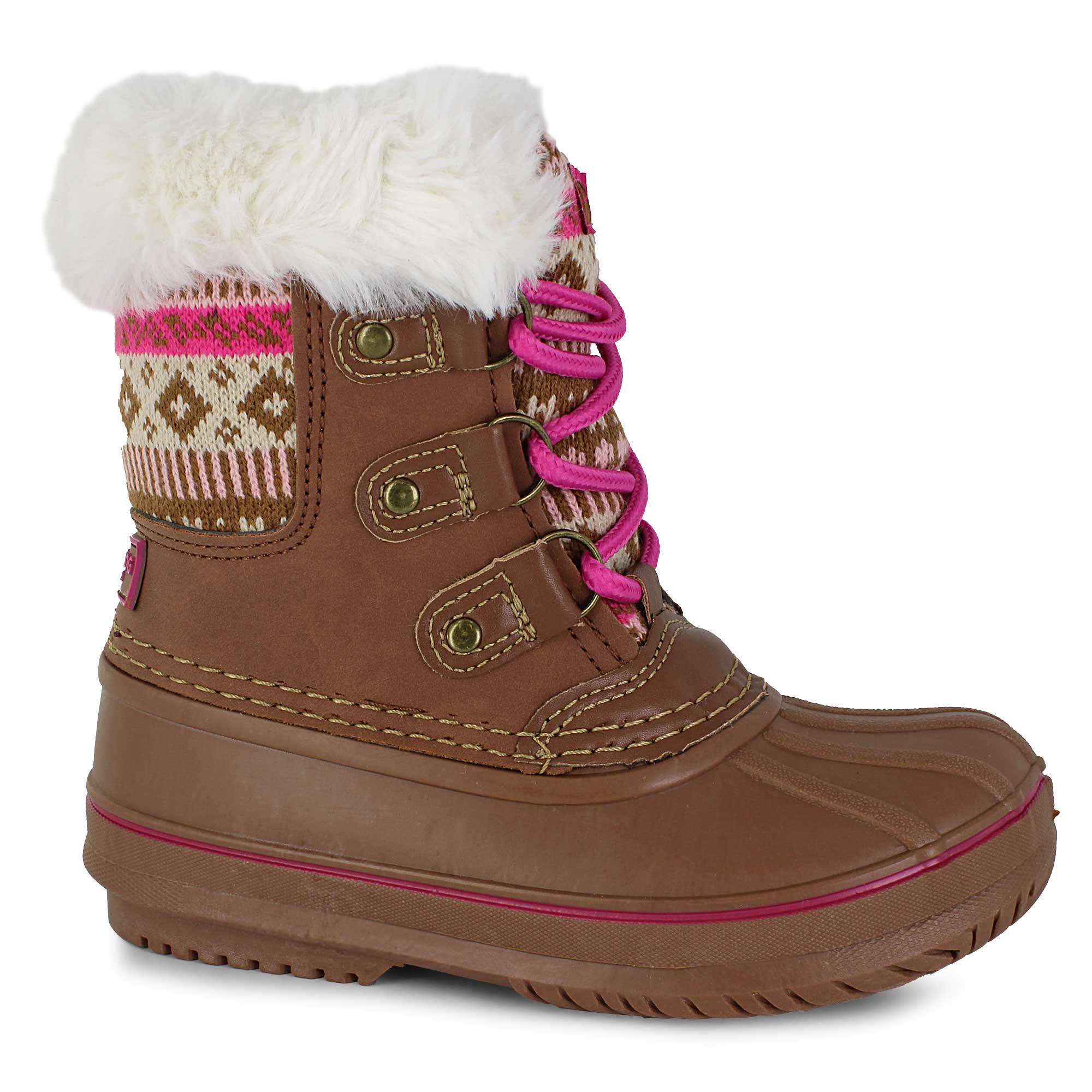 These trendy winter boots bring fashion-forward style with a cozy knit pattern and soft faux-fur trim. Inside, a warm faux-fleece lining keeps little feet snug through chilly days. Lightweight and flexible with easy lace-up styling, they're perfect for winter exploration.