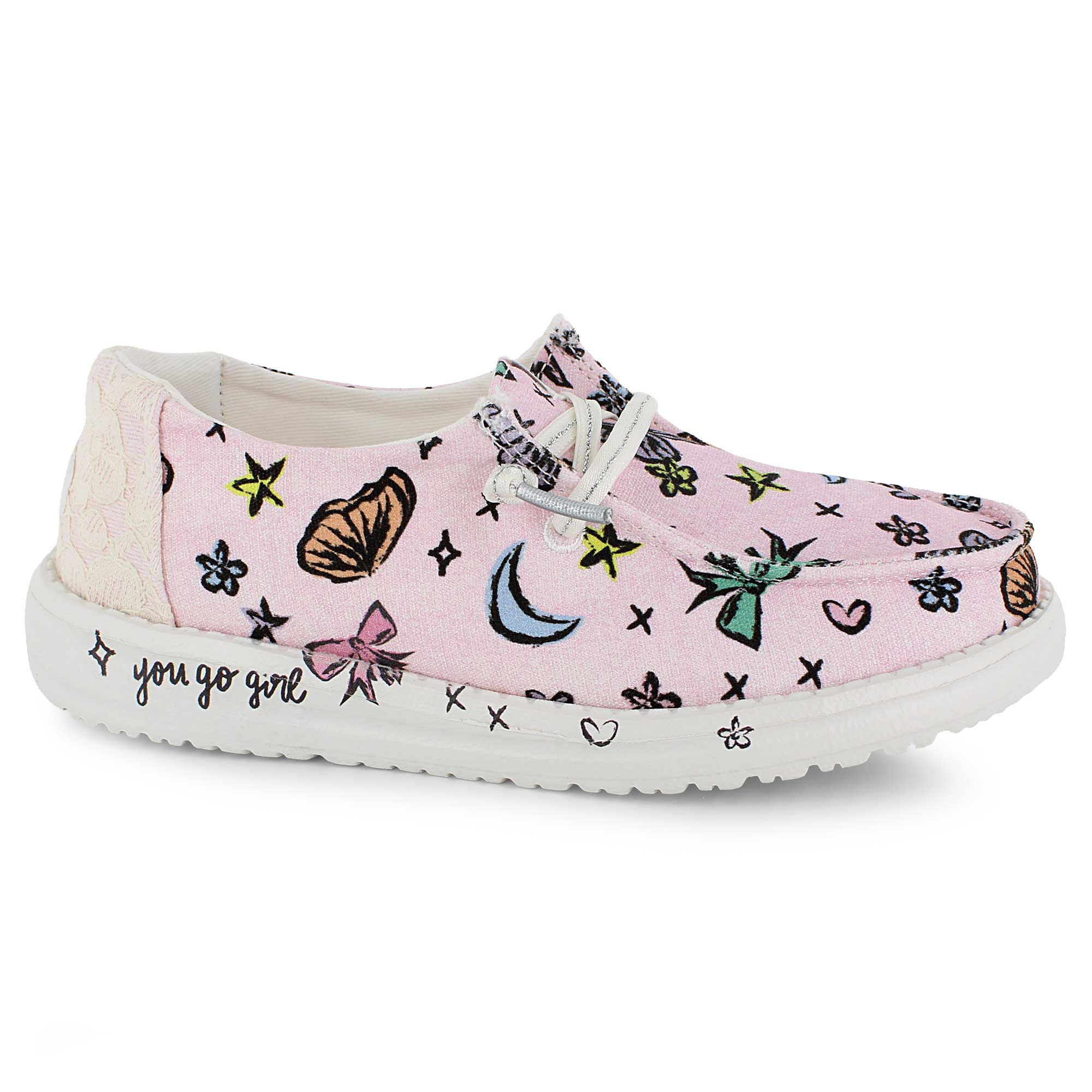Relax and let your feet choose the path. These comfy and lightweight HEYDUDE slip-on sneakers are a laid-back way to enjoy fashion without pain. Artistic designs on the upper and text on the midsole add whimsy and style.