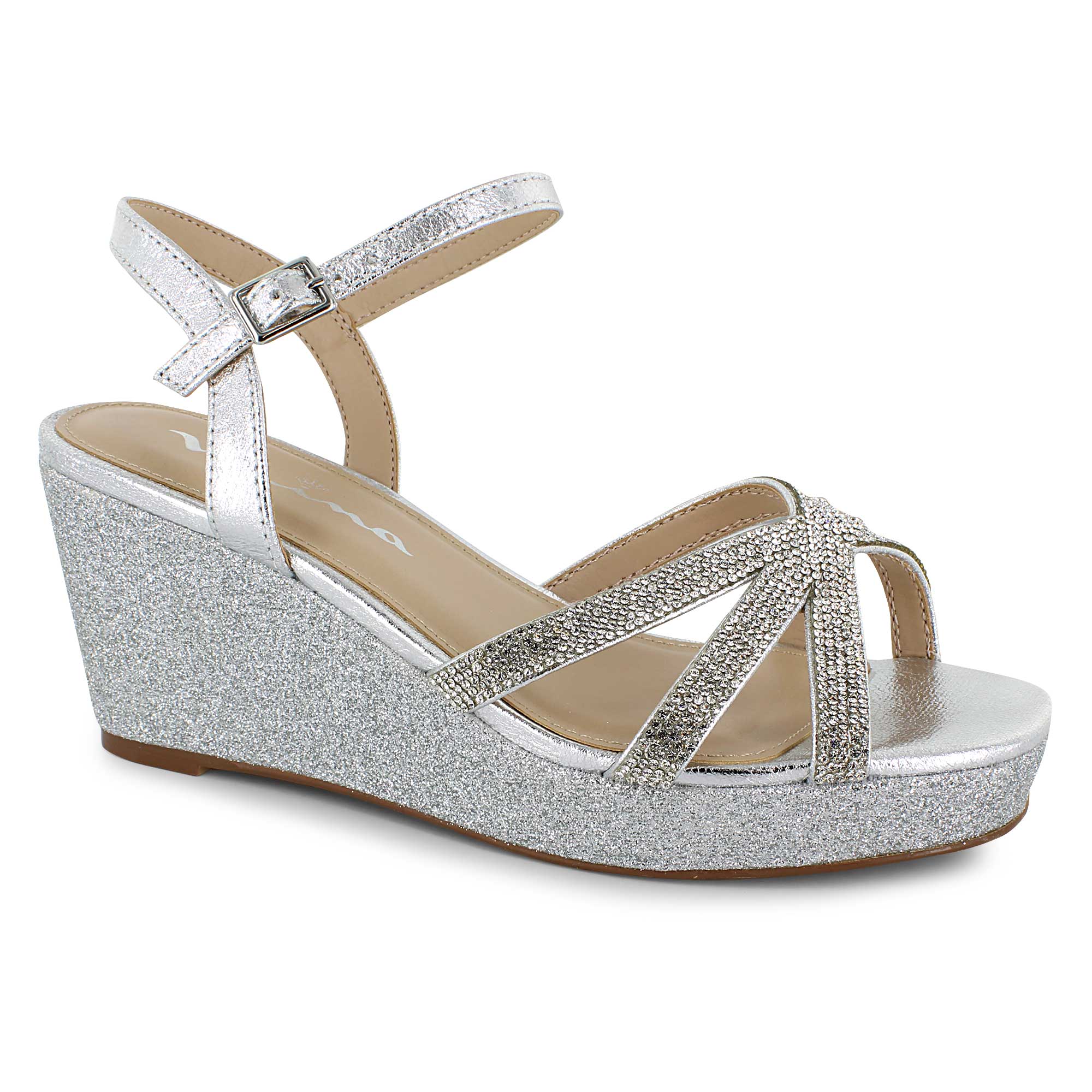 Step into the spotlight with these statement-making Nina dress shoes. A glittery wedge sole paired with rhinestone accents adds shine and sophistication. Perfect for dances, parties, or any event where standing out is a must.