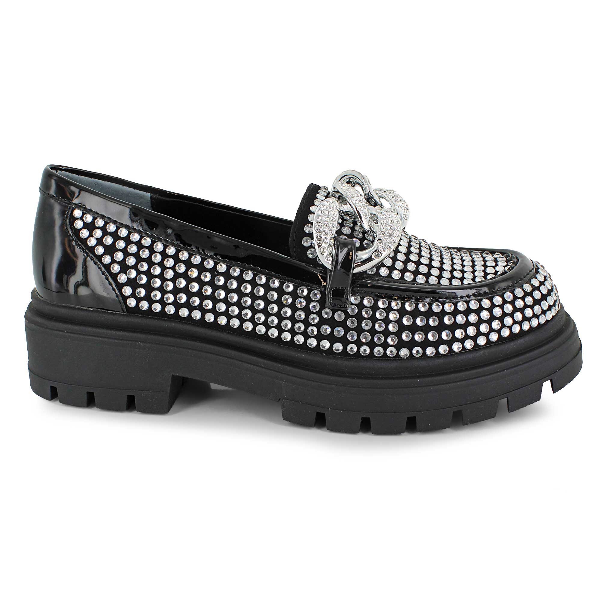 Turn heads with this Nina fashion dress casual designed to shine. Eye-catching rhinestones cover the upper, while an embellished accent chain adds bold, standout style across the top of the foot. A raised sole with a durable outsole completes the look with confidence and everyday wearability.