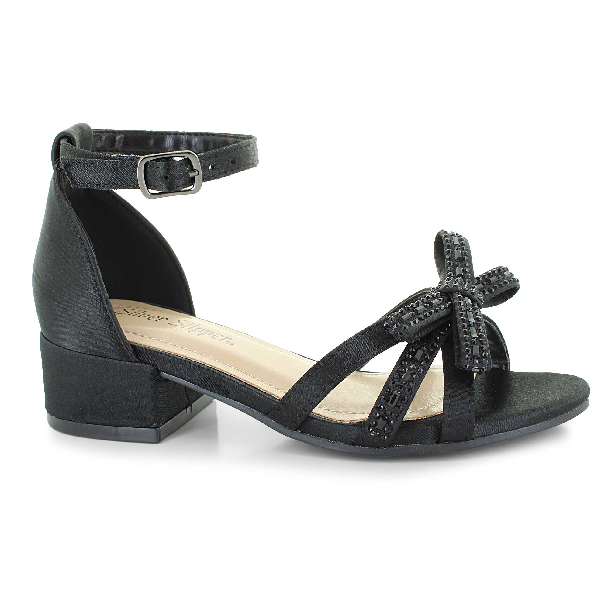 Add a touch of sparkle to special moments with these charming Silver Slipper dress shoes. A rhinestone-accented bow delivers standout shine with sweet, polished style. An adjustable buckle closure provides a secure fit through any event.
