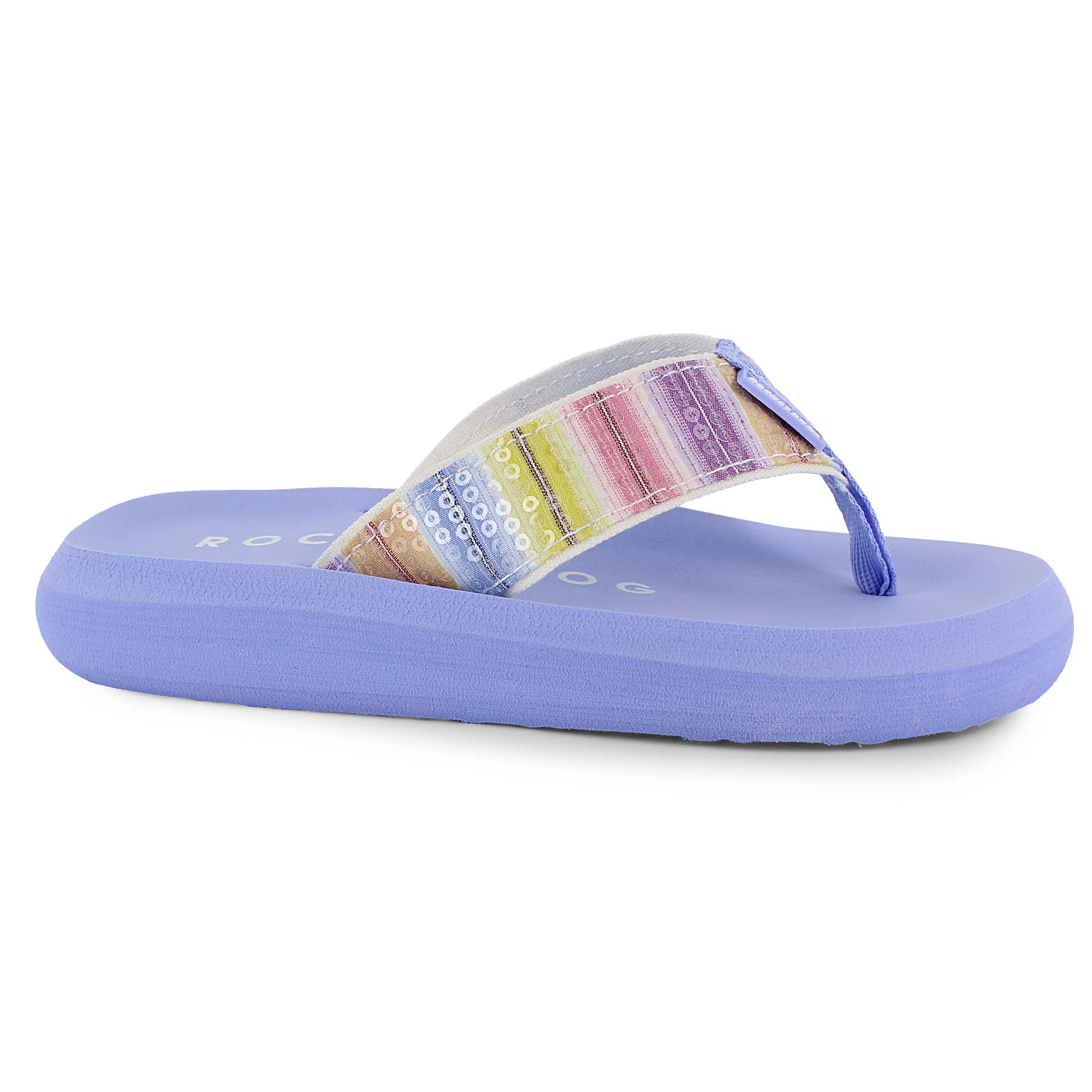Brighten sunny-day outfits with Rocket Dog fashion sandals. A colorful strap upper with sequin detailing adds eye-catching sparkle to every step. The thick cushioned footbed helps keep feet comfortable through all-day adventures.