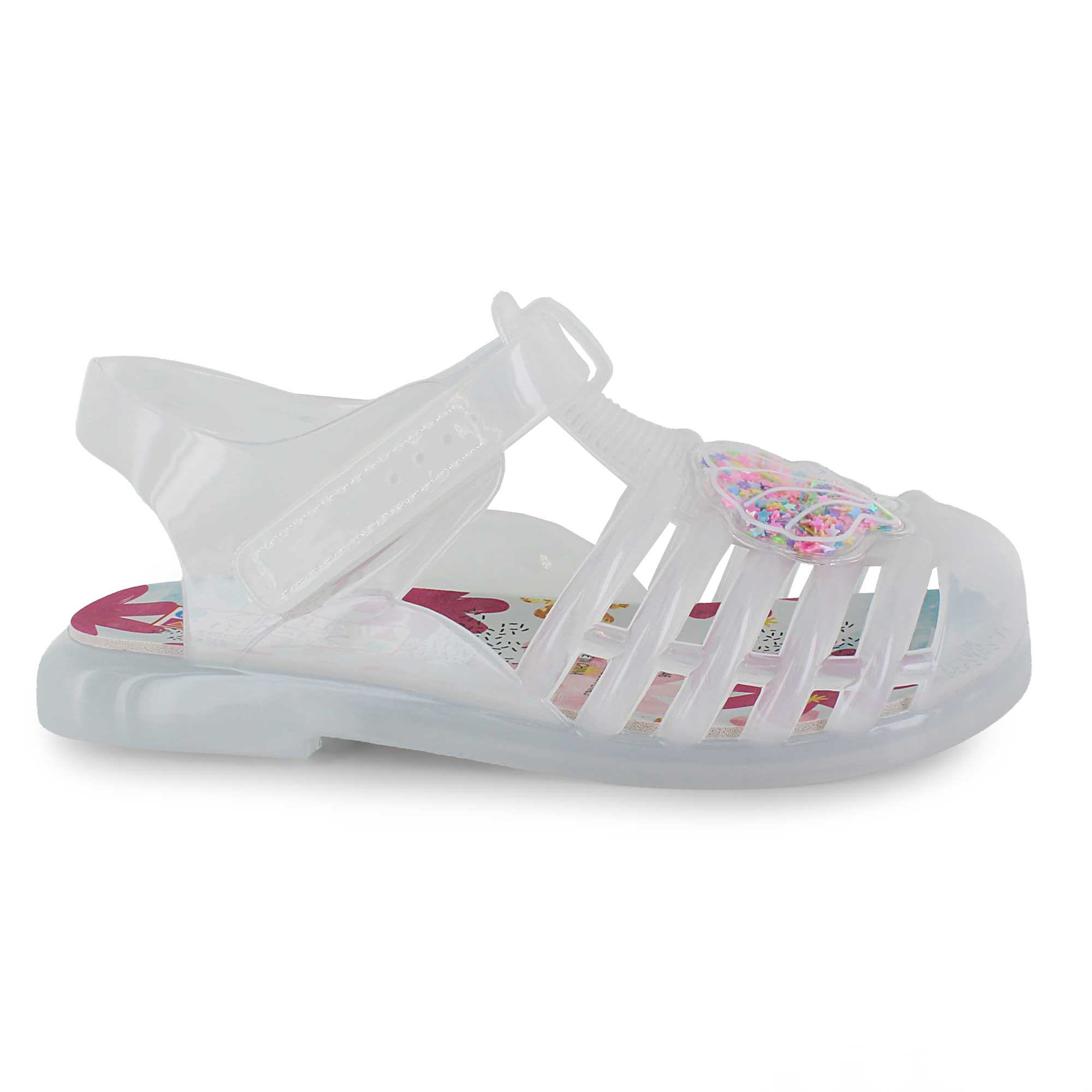 Make waves in these fun jelly sandals featuring a translucent upper and an adjustable strap for a secure fit. A clear seashell-shaped bubble filled with movable confetti adds a splash of playful charm to every step. The flexible sole keeps little feet comfy from beach days to boardwalk strolls.