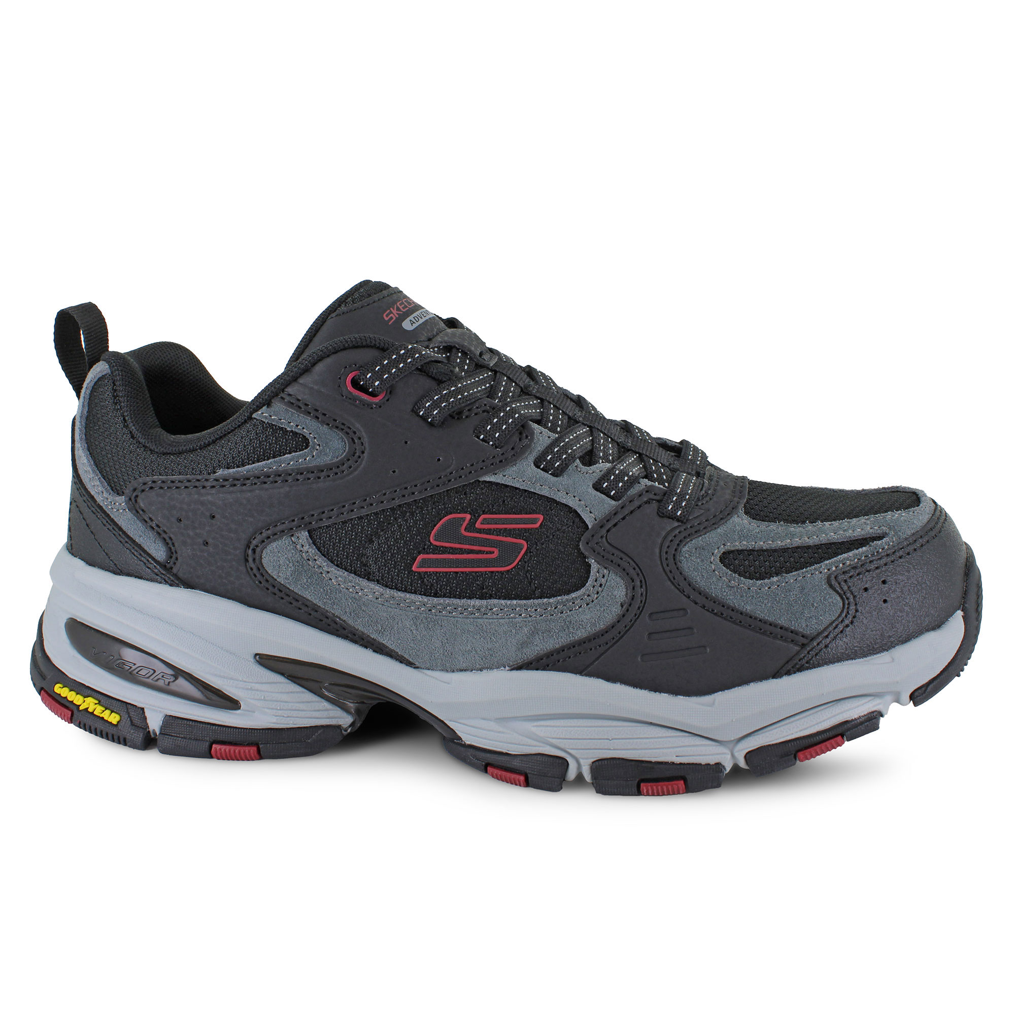 For an athletic shoe that's as tough as you, try the Skechers Vigor 3.0. With an upper crafted from durable leather and breathable synthetic mesh, an elastic bungee front closure design, and a perforated front panel to keep your foot cool during any workout or activity. An Air-Cooled Memory Foam insole cushions your foot with every step, while the durable Goodyear rubber outsole reduces your risk of losing traction.