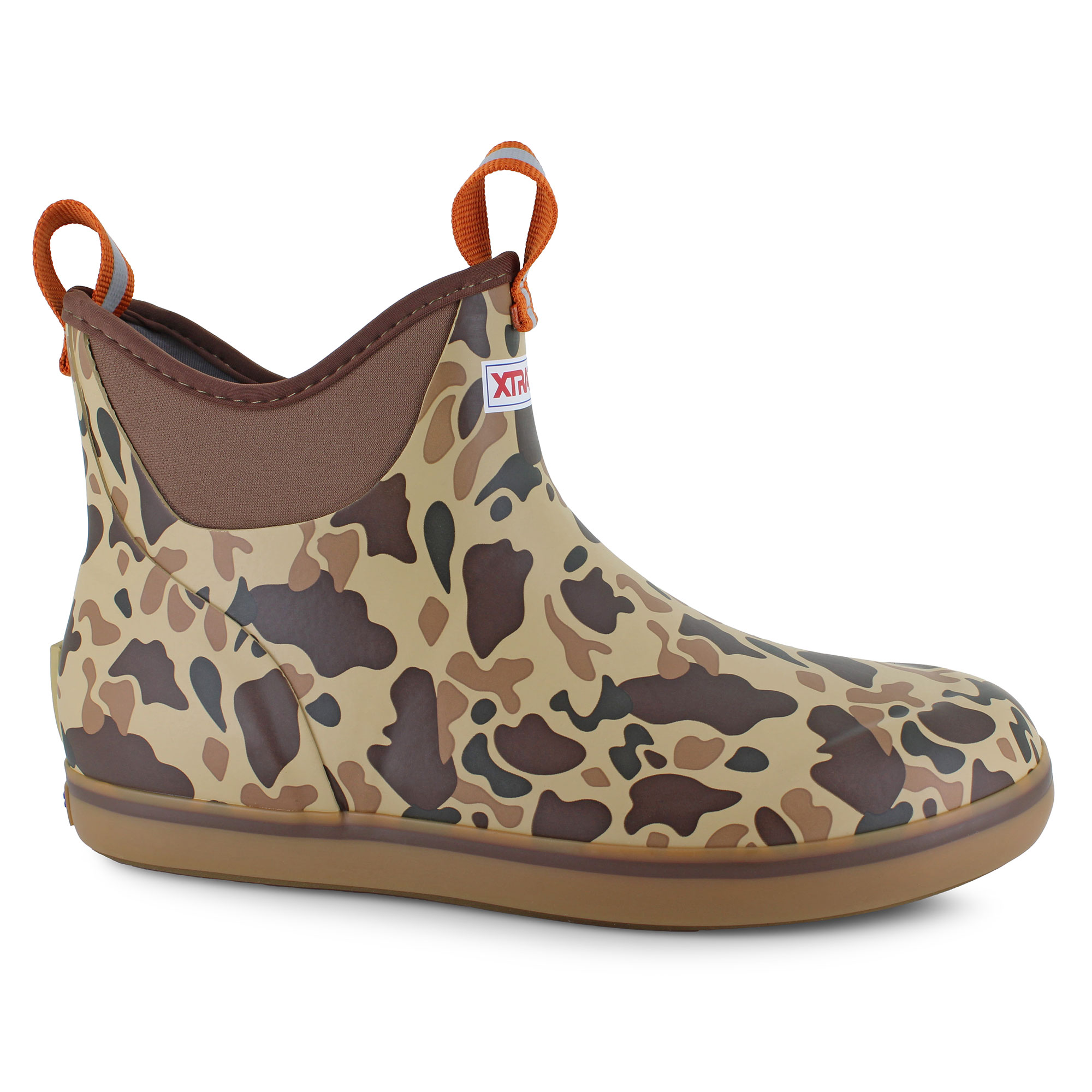 Brave the elements in the XtraTuf 6" Ankle Deck Boot. Engineered from neoprene and rubber that creates a durable, 100% waterproof pull-on that's ready to conquer Mother Nature, featuring bold duck camouflage patterning. The molded footbed combined with an XPRESSCOOL liner provides all-day comfort, while dual heavy-duty pull-tabs provide an easier on and off when the day is done. A slip-resistant Chevron rubber outsole ensures superior non-marking traction and stability, no matter the weather or surface.