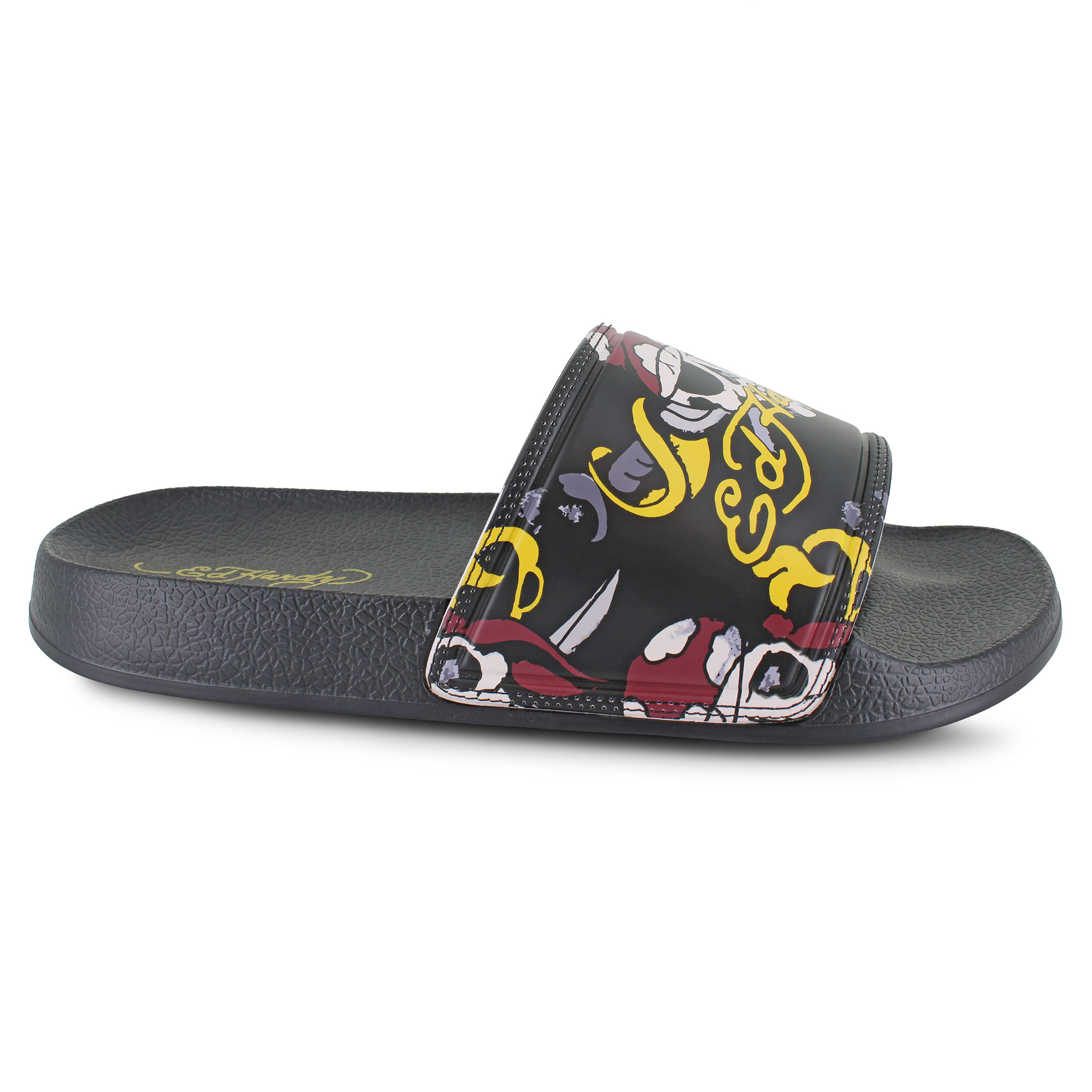 Take a load off with the Ed Hardy Pirate slide. Whether you're hitting the locker room or the pool, sink into cushy comfort when you're ready to call it a day. A bold synthetic molded bandage strap features bold pirate designs and secures your foot in place, while a contoured footbed helps recharge your foot with layered comfort.