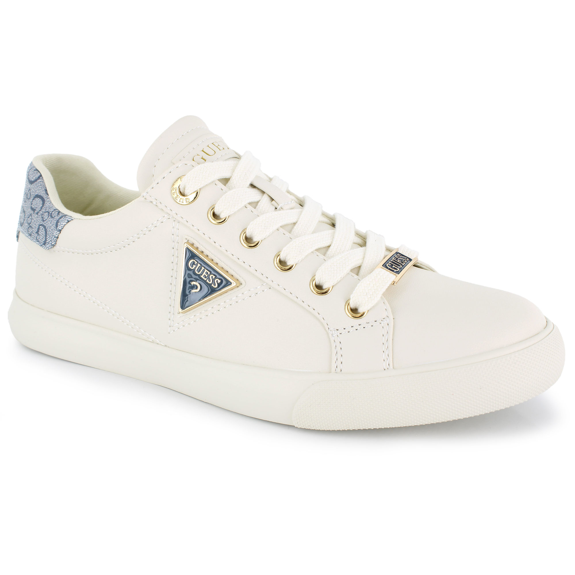 Meet the Guess WG River sneaker, where practicality meets wow. This fashion-forward kick features a crisp faux-leather finish and intricate stitching, but it's the gold-colored accents and denim branding that truly steal the show. Designed with a secure lace-up fit and a high-traction rubber sole, it offers the perfect balance of stability and sophisticated flair.