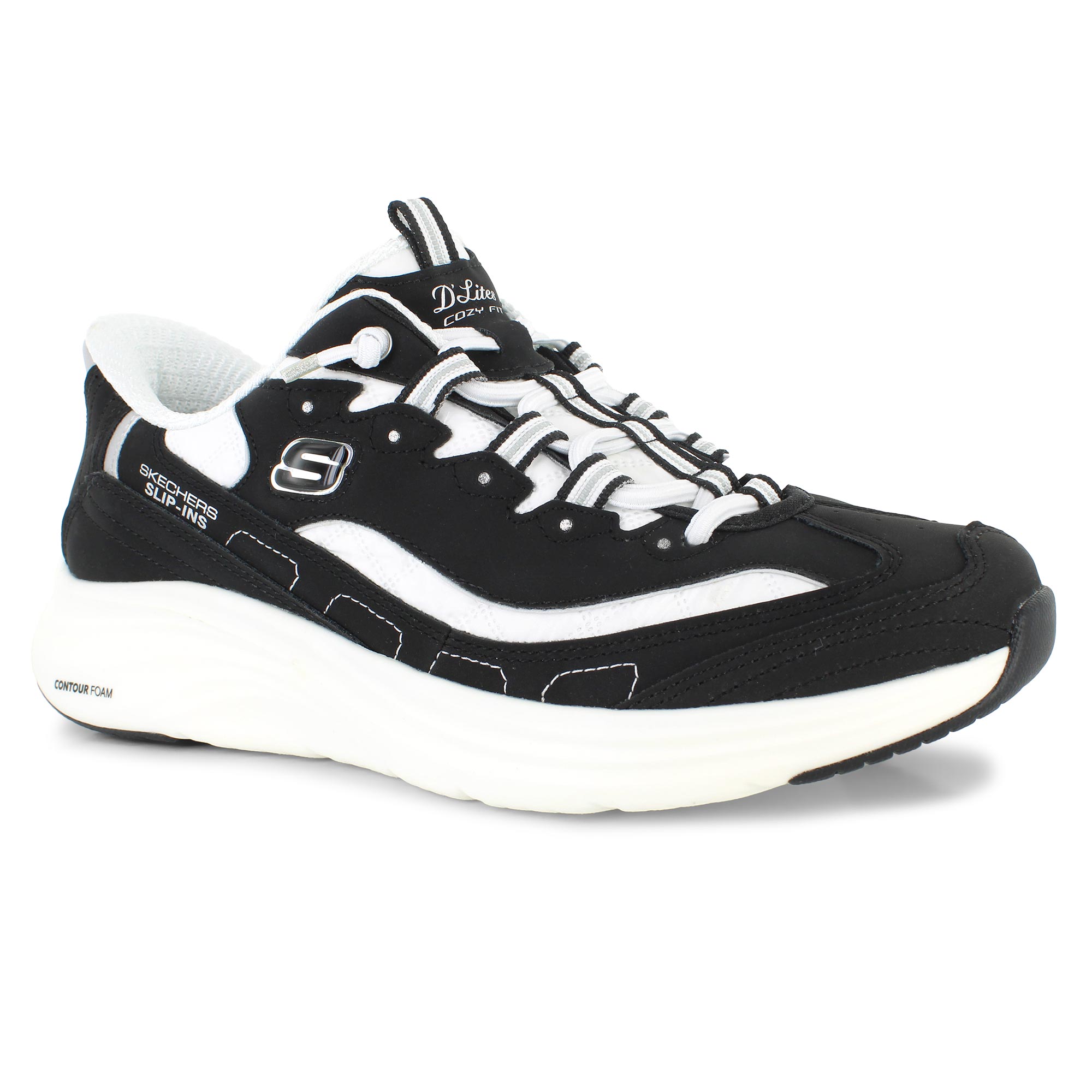 Step into comfort in the Skechers Slip-ins - Contour Foam - Cozy Fit D'Lites. This casual slip-in sneaker features tied-off stretch laces, Contour Foam midsole cushioning and a signature Skechers Air-Cooled Memory Foam insole for ultimate ease and comfort. Keep your steps cozy with the duraleather and air-quilted mesh underlay upper.