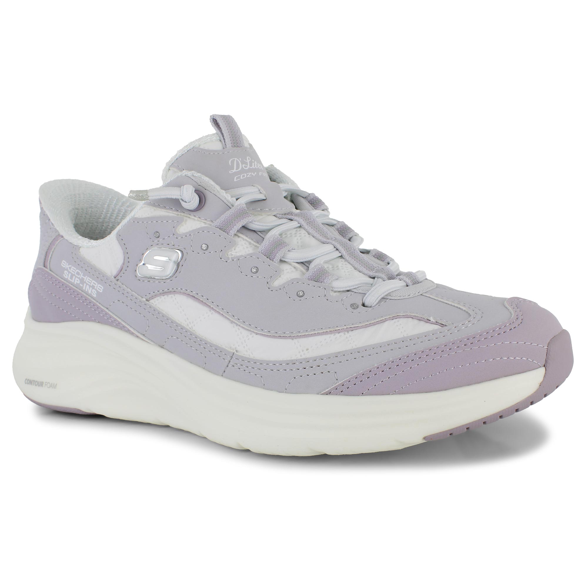 Step into comfort in the Skechers Slip-ins - Contour Foam - Cozy Fit D'Lites. This casual slip-in sneaker features tied-off stretch laces, Contour Foam midsole cushioning and a signature Skechers Air-Cooled Memory Foam insole for ultimate ease and comfort. Keep your steps cozy with the duraleather and air-quilted mesh underlay upper.