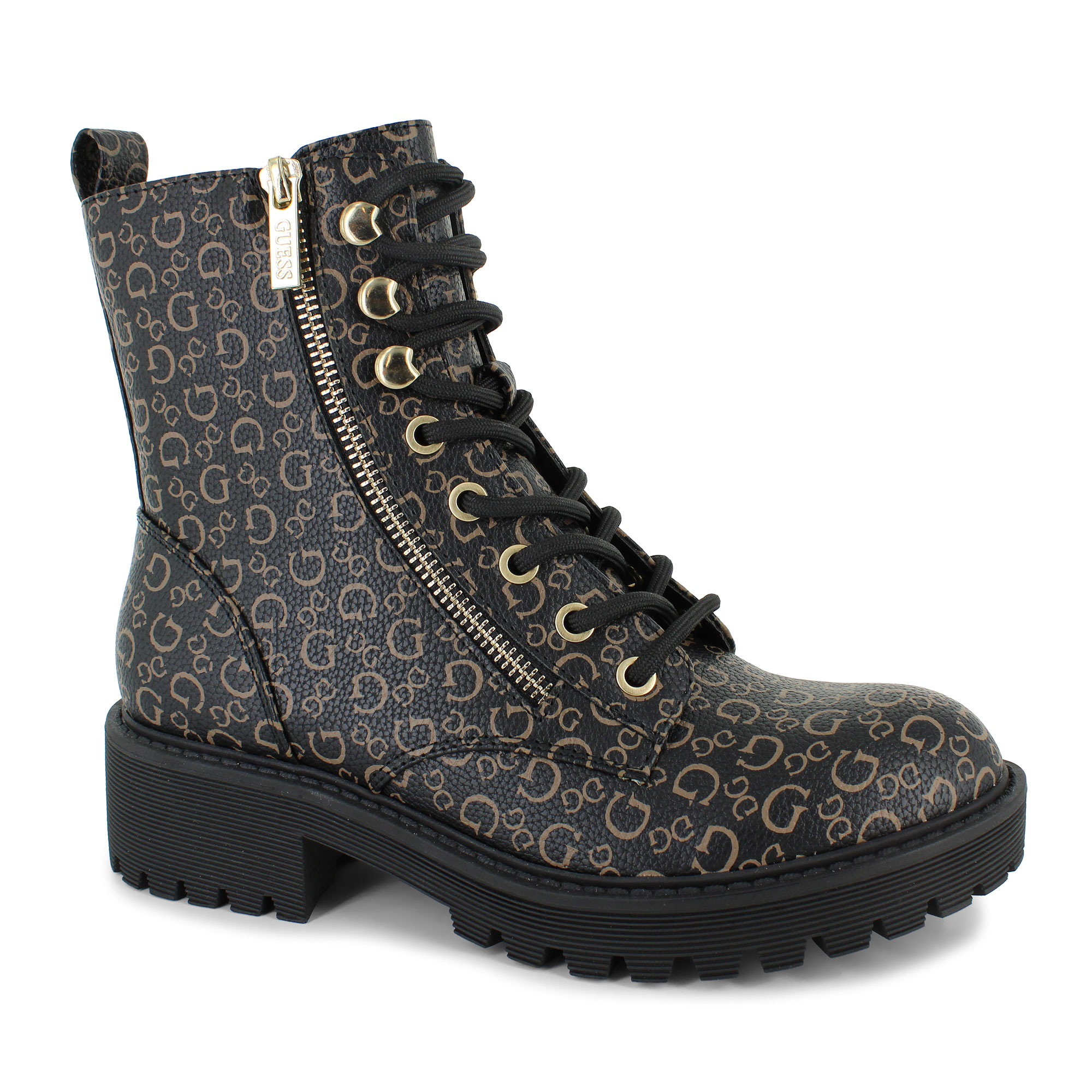 Lace up in the Guess T-Locate boots for a bold statement. The all-over iconic G logo print pattern and chunky traction outsole adds instant edge to any look. A lace-up closure, side zipper and back pull tab allows for easy changes and a secure fit to keep your steps confident.
