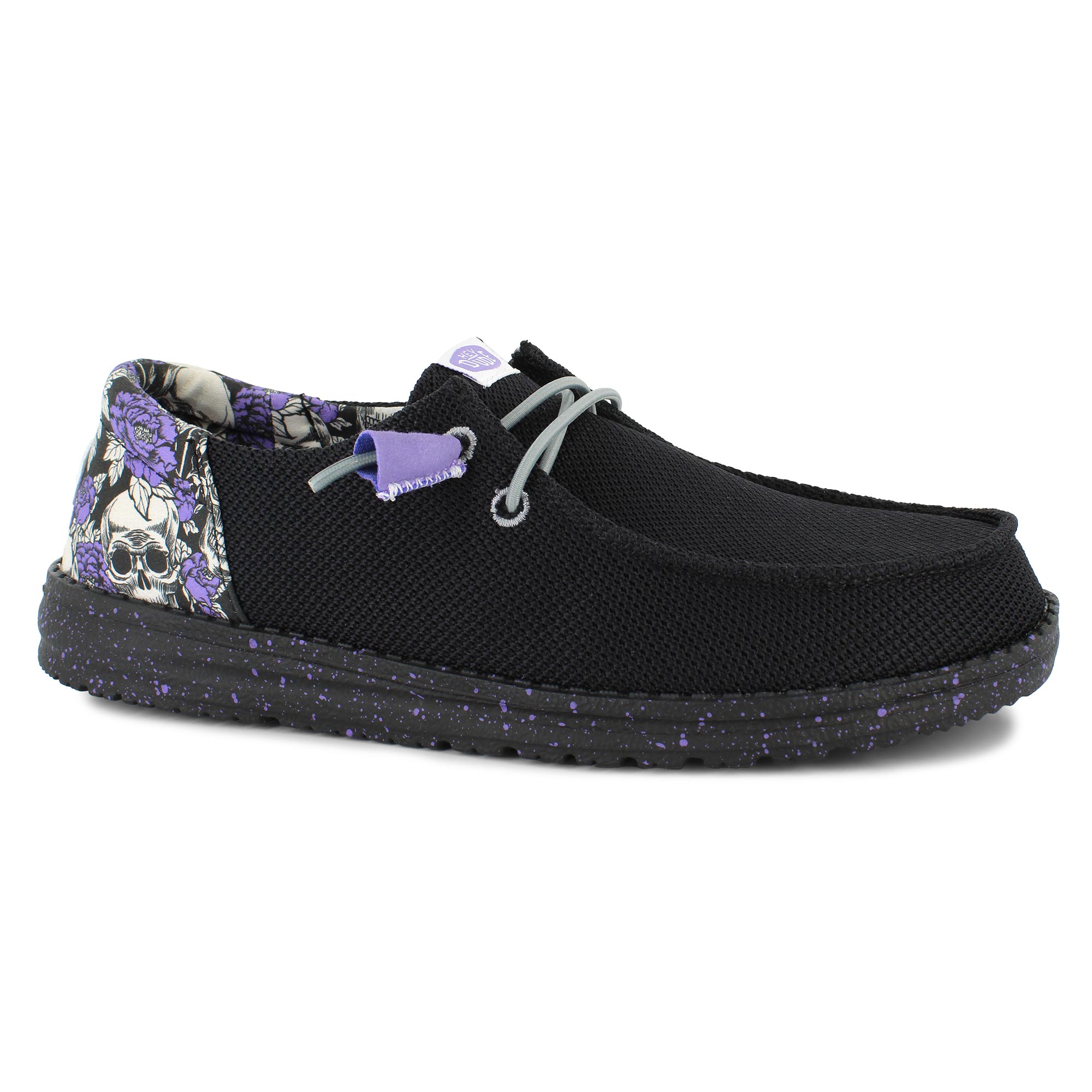 Bring a little edge to your casual look in the HEYDUDE Wendy Rose Skull slip-on shoe. Designed with a breathable mesh fabric upper and foam insole, these lightweight shoes keep you comfy and supported throughout your day. Featuring a rose and skull print on the heel and splatter design on the outsole to keep your look effortlessly cool.