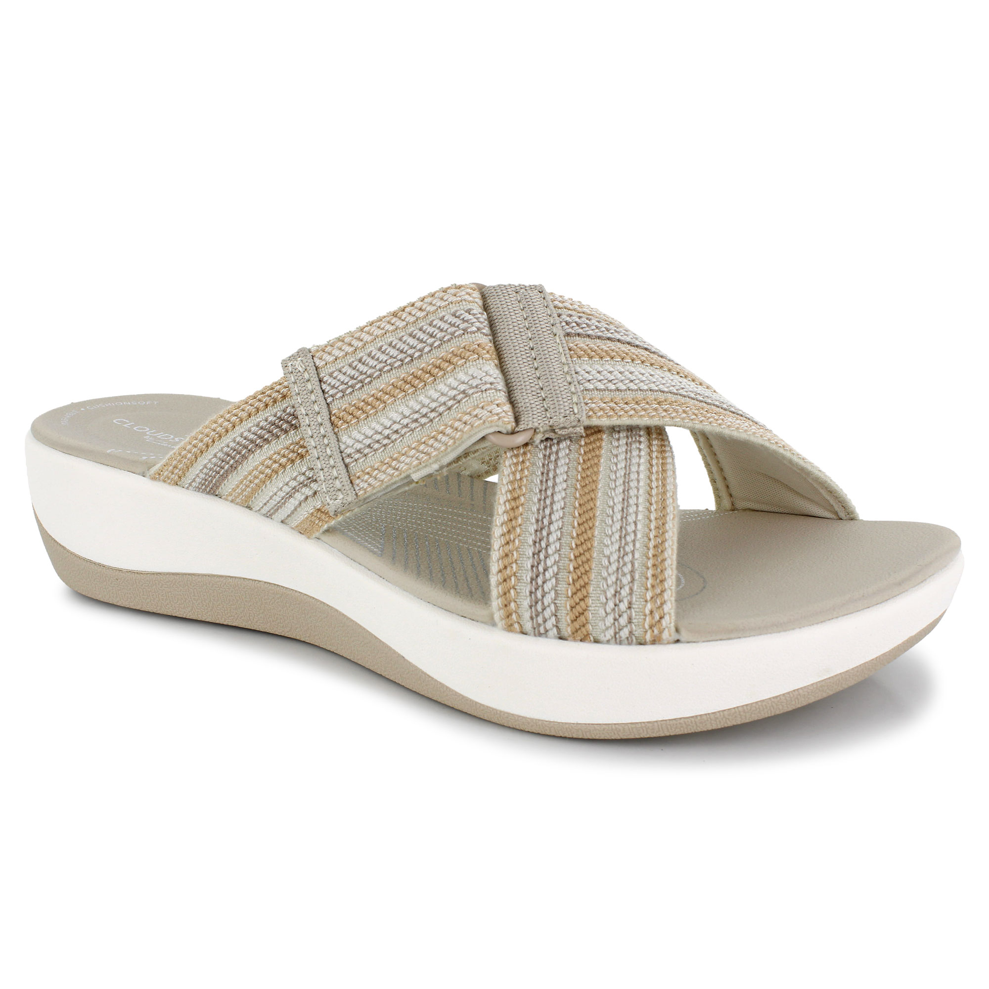 Comfort awaits in the Clarks Cloudsteppers Arla Wave sandal. With a cushionsoft footbed for supported steps and a fabric upper for extra comfort. Patterned criss-cross straps with elasticity and a velcro hook and loop closure ensure a secure fit.