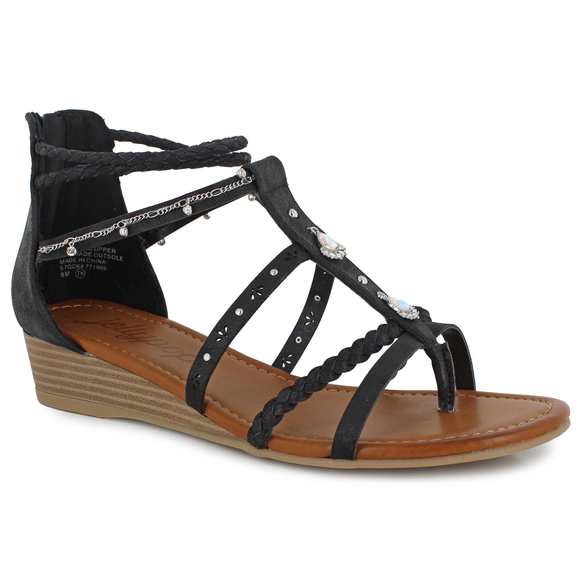 Step into warm weather with confidence in the Jellypop Avelisse sandal. It's all in the details with this sandal, featuring braided straps, cut-out designs, rhinestones, studs and chains. Your steps will feel secured with the zip-up back and lifted heel, giving you an elevated look.