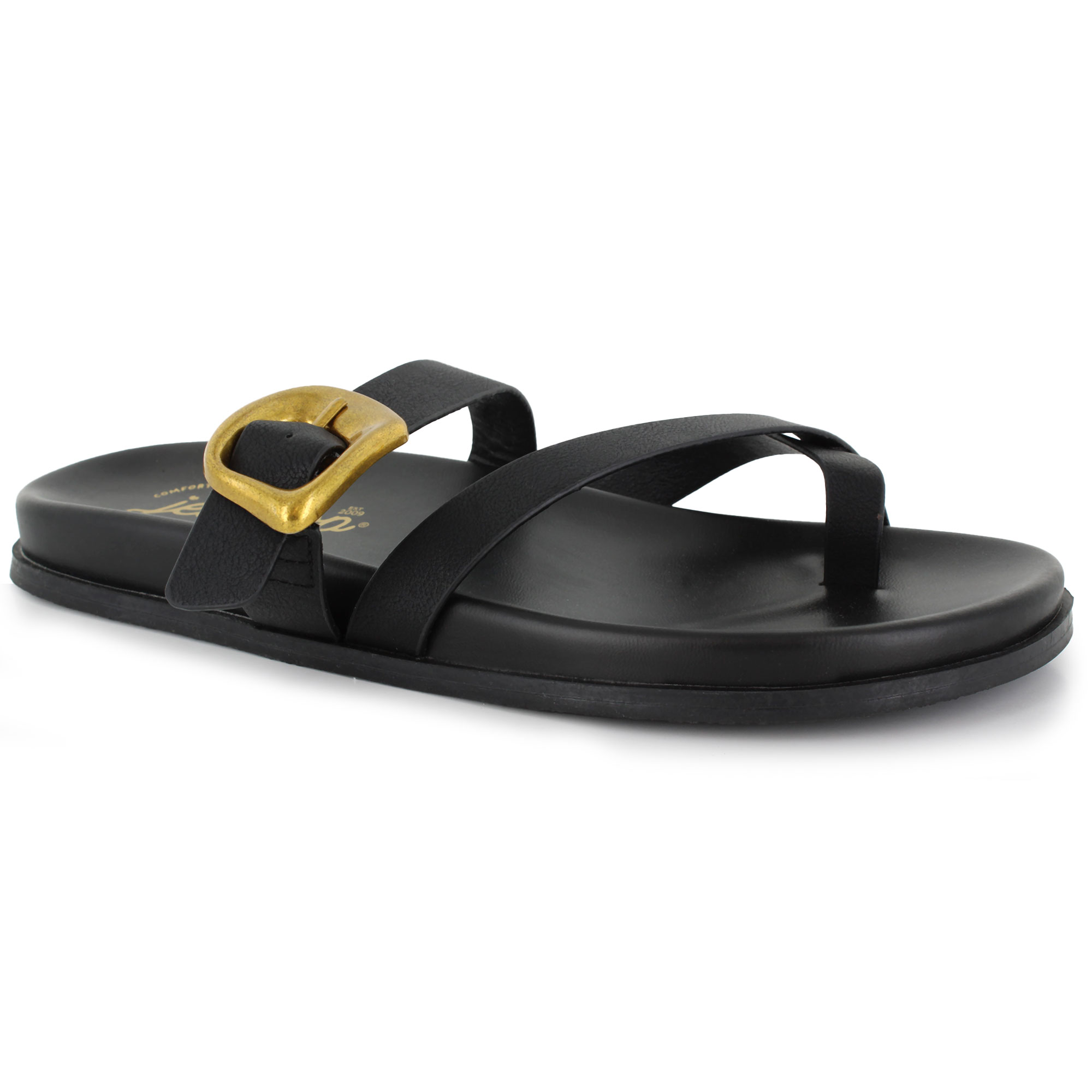 Meet your new favorite warm-weather staple: the Jellypop Finnian. This effortlessly cool sandal combines a minimalist toe-loop design with a polished gold buckle detail, instantly elevating your casual brunch or beach-day attire. Built with a focus on all-day wearability, the cushioned, supportive footbed provides the comfort you need. With its quick slip-on design and versatile aesthetic, the Finnian takes the guesswork out of getting ready.