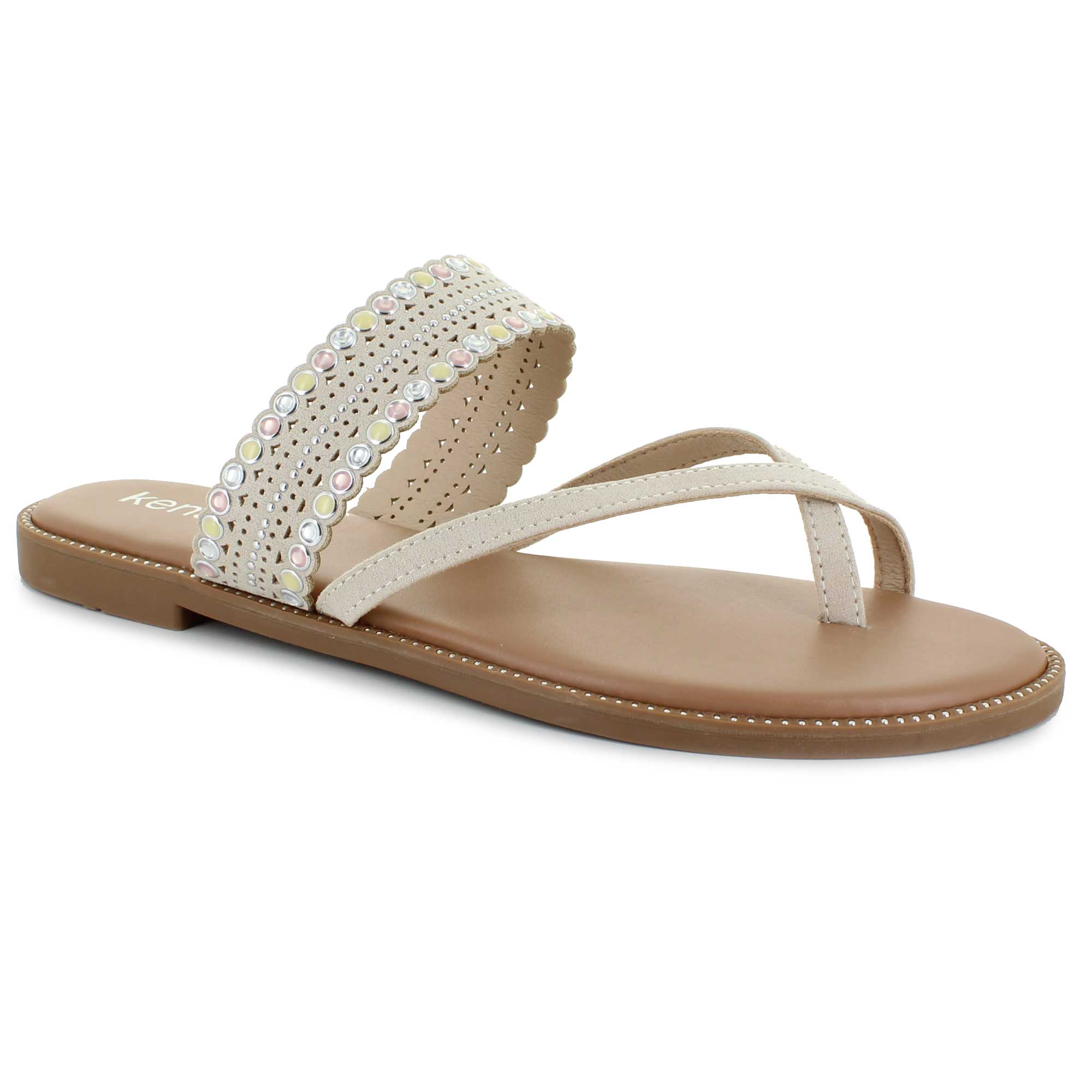 Step into effortless style with the Kensie Maddy sandal, designed for both comfort and sophistication. Featuring a sleek synthetic upper with intricate laser-cut accents and stud details, this slip-on sandal adds a touch of modern flair to any outfit. The cushioned comfort insole ensures all-day wearability, while the flexible outsole provides easy movement with every step. Perfect for warm-weather outings, this versatile sandal pairs beautifully with casual and dressy looks alike. Elevate your everyday footwear with the chic and comfortable Kensie Maddy.