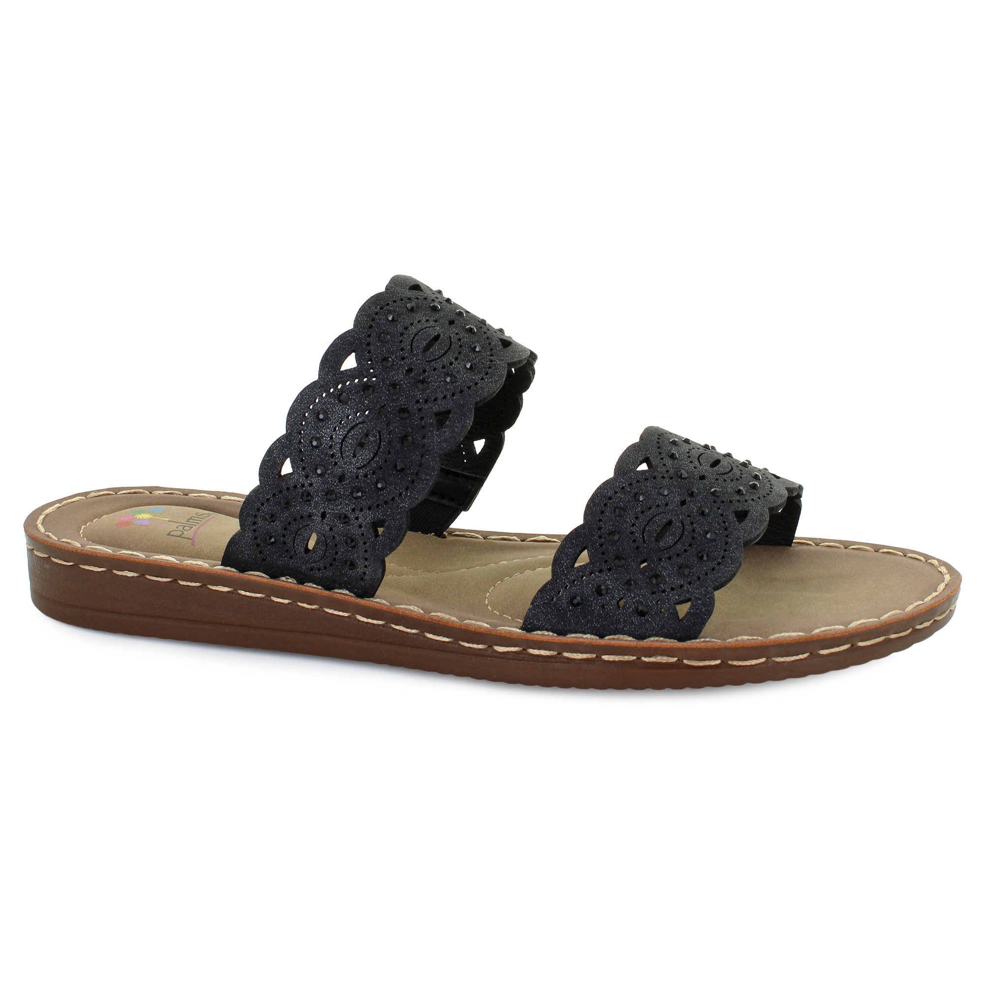 Elevate your everyday style with the Palms Luisa Slide, a chic and comfortable sandal designed to add subtle sparkle to your warm-weather wardrobe. Featuring a modern perforated upper with eye-catching black rhinestone accents, this slide sandal blends breathable design with a touch of glam. The easy slip-on silhouette makes the Luisa Slide perfect for on-the-go days, whether you'reheading to brunch, running errands, or relaxing on vacation. Its lightweight construction and cushioned footbed provide lasting comfort, while the perforated detailing enhances airflow for all-day wearability. The black rhinestone embellishments add just the right amount of shine, making this sandal versatile enough to dress up casual outfits or complement laid-back looks. Shop SHOE DEPT. ENCORE today.
