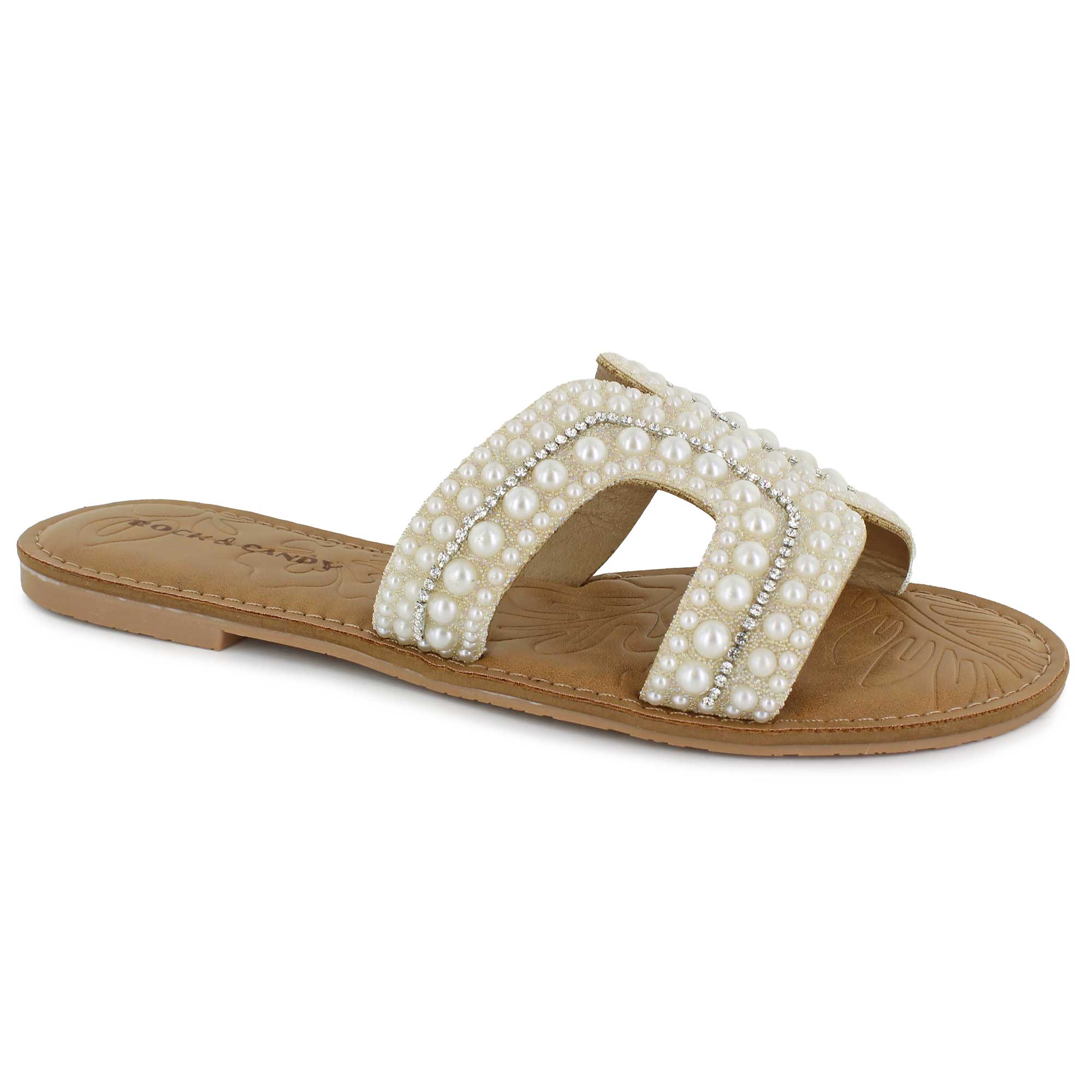 The Rock and Candy Collete sandal adds the perfect touch of bling and sophistication to your looks this season. With a slip-on design and lightly padded footbed embossed with botanical designs for comfort made for your summer plans. Featuring rhinestones and pearls on the upper that shine with every step.