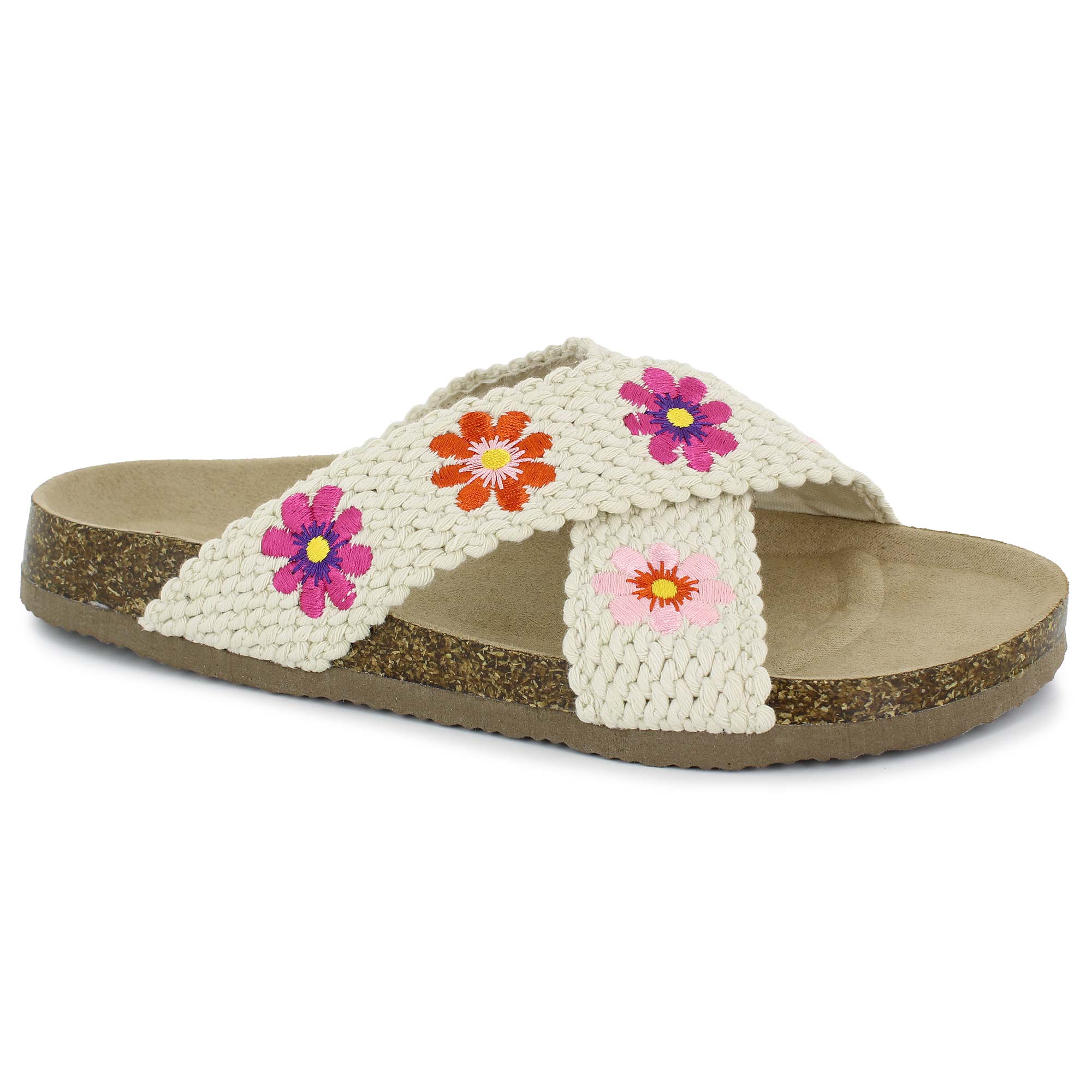 Step into flower power in the Unionbay Maryam Flower footbed sandal. Perfect for warm weather days and quick getaways. Stay ready for your vacations with the woven upper featuring cute embroidered flowers.