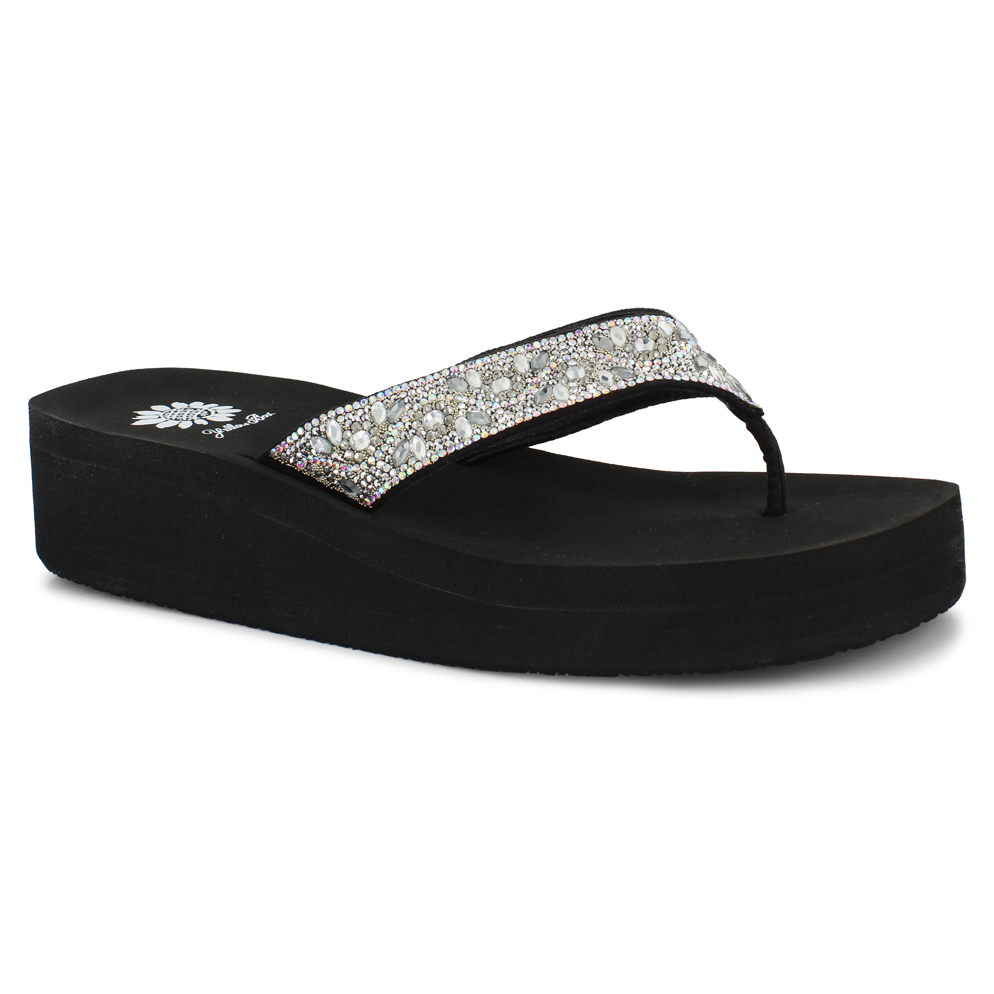 Add a touch of Glam to your step in the Yellow Box Rosana sandal. This thong sandal's strap is adorned in dazzling rhinestones arranged in a glamorous pattern. With a bit of lift, you and your look will be elevated. Perfect for adding a touch of sparkle to your casual looks.