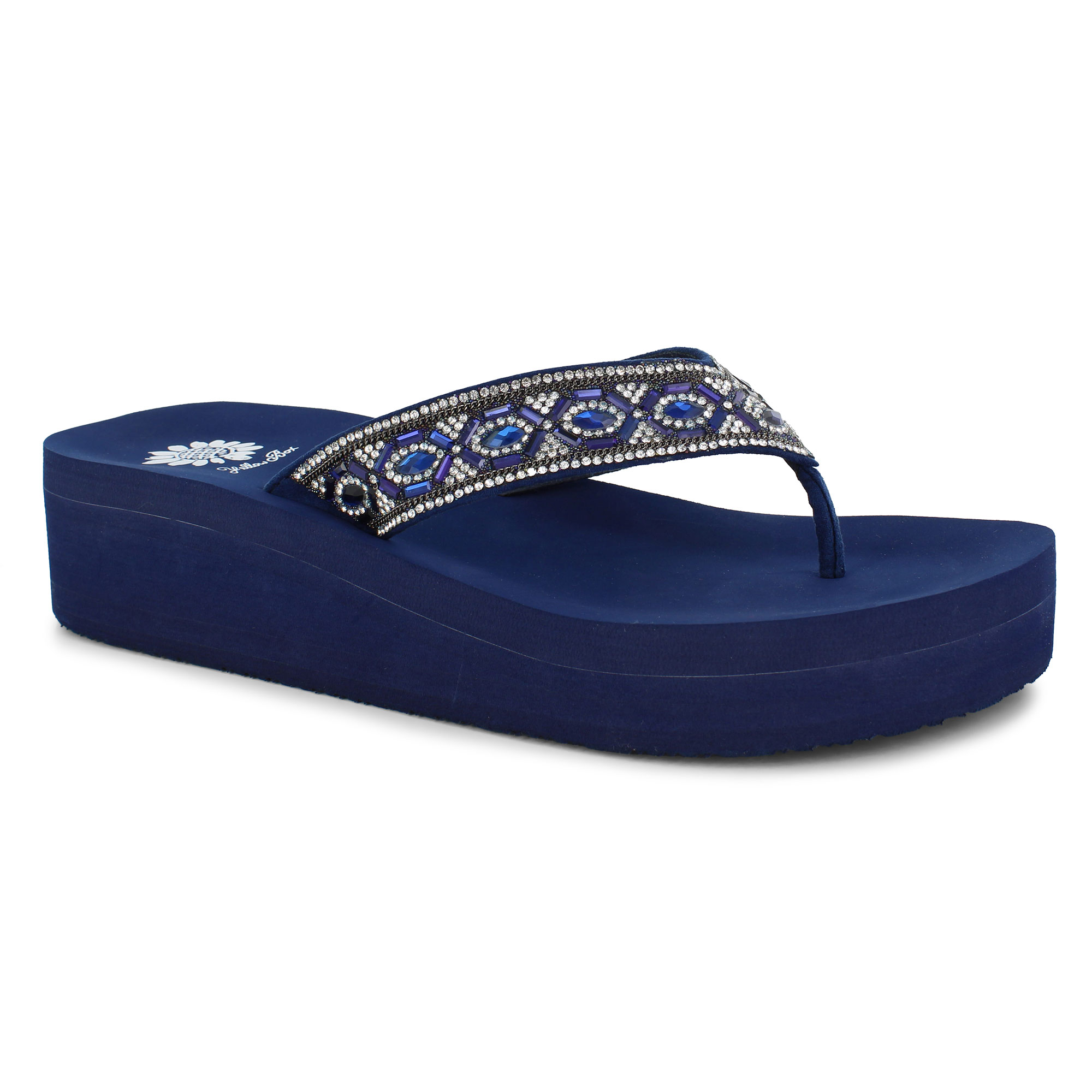 Add a touch of Glam to your step in the Yellow Box Sarinah sandal. This thong sandal's strap is adorned in dazzling rhinestones arranged in a glamorous pattern. With a bit of lift, you and your look will be elevated. Perfect for adding a touch of sparkle to your casual looks.
